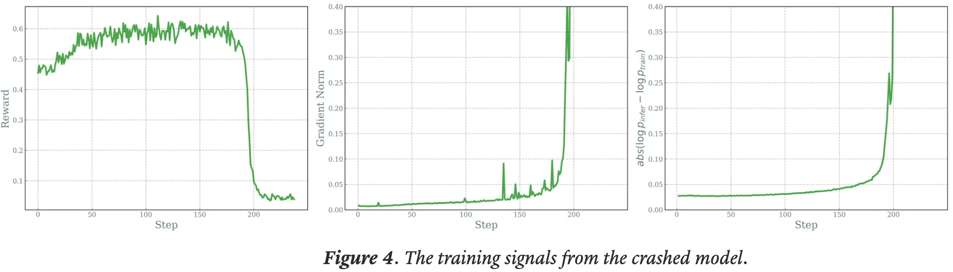 • The mismatch issue quickly causes crashes during on-policy MoE RL training.