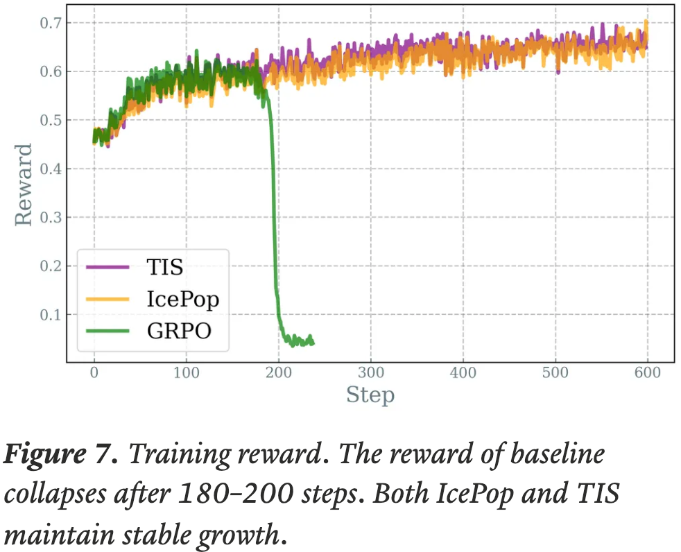 • 值得注意的是,IcePop 和 TIS 都在 600 个梯度步内缓解了 RL 训练的不稳定性,避免了基线设置中发生的快速训练崩溃