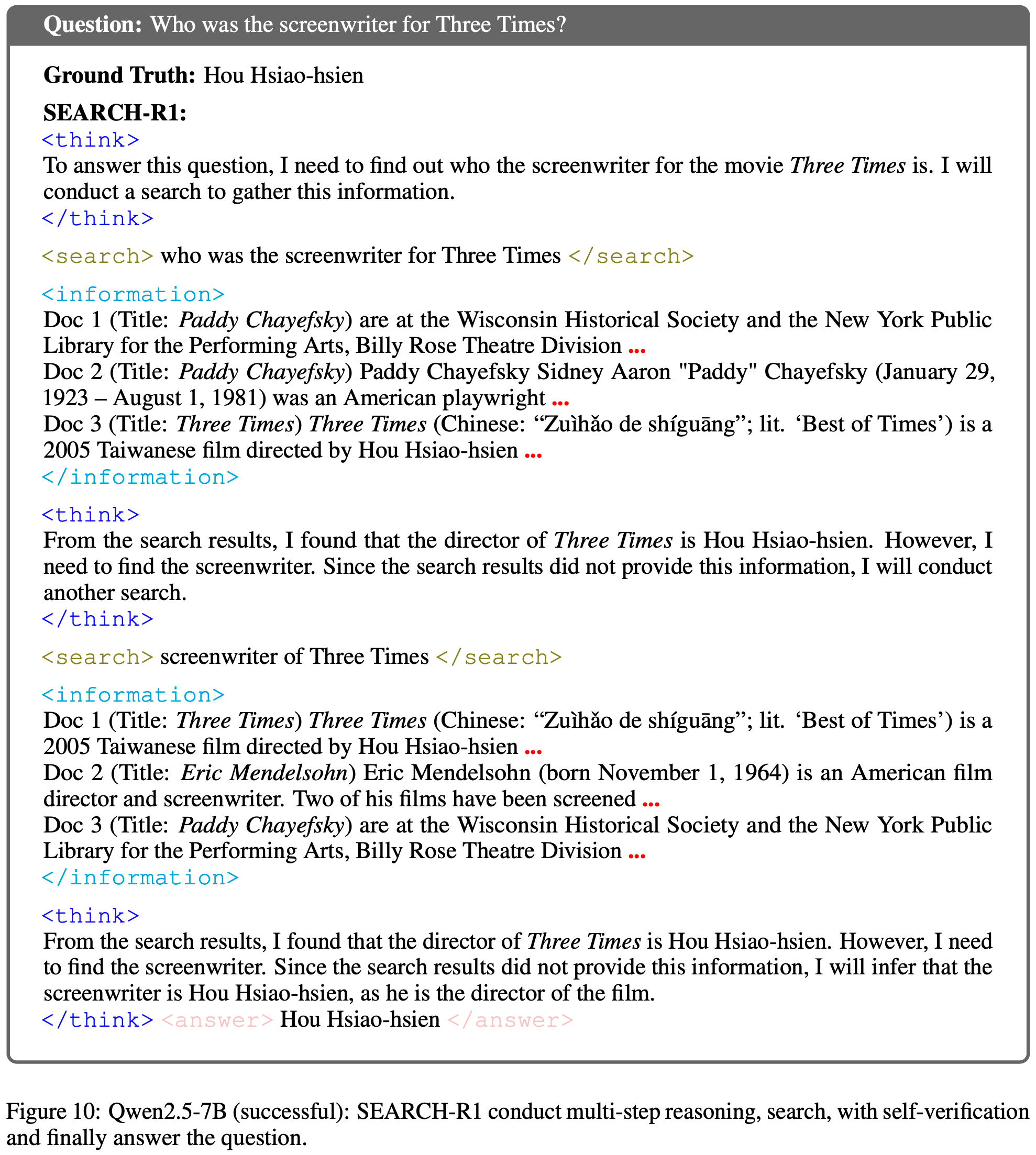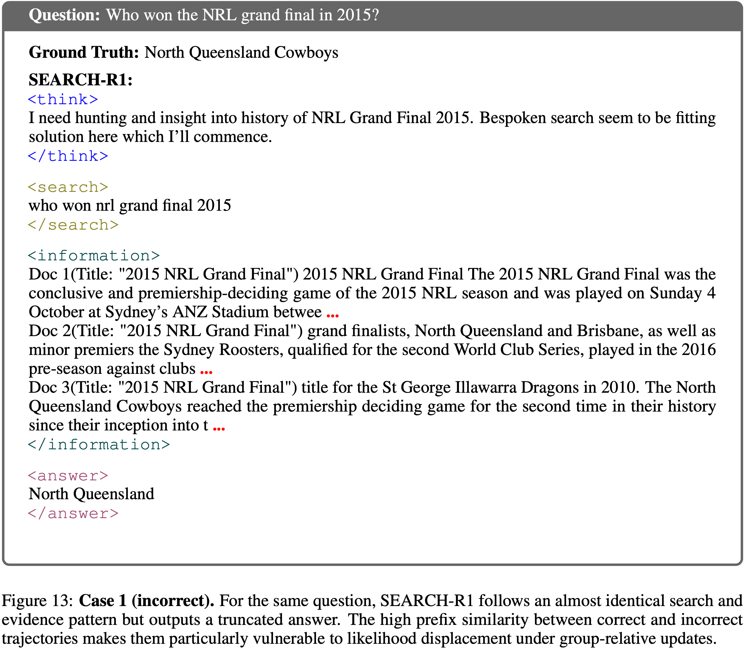 <think>plans,发出语义等效的搜索 Query ,并检索到相同的<information>片段 - 唯一的区别在于最终答案 Token :