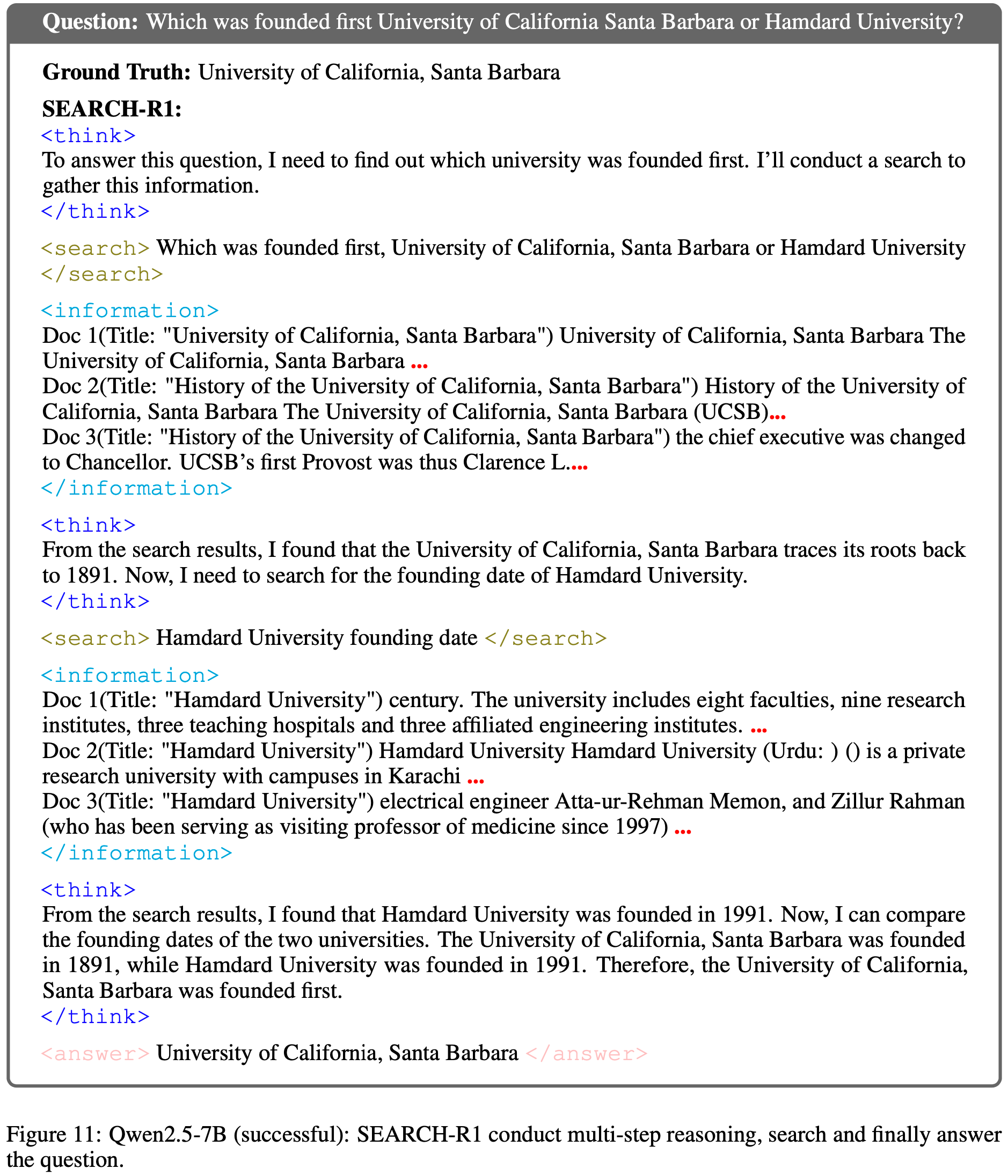 - 如图 10 和图 11 所示,该模型不仅执行逐步分解和自我验证,还在需要时执行连续的搜索调用,有效整合检索到的证据,并产生正确、简洁的最终答案