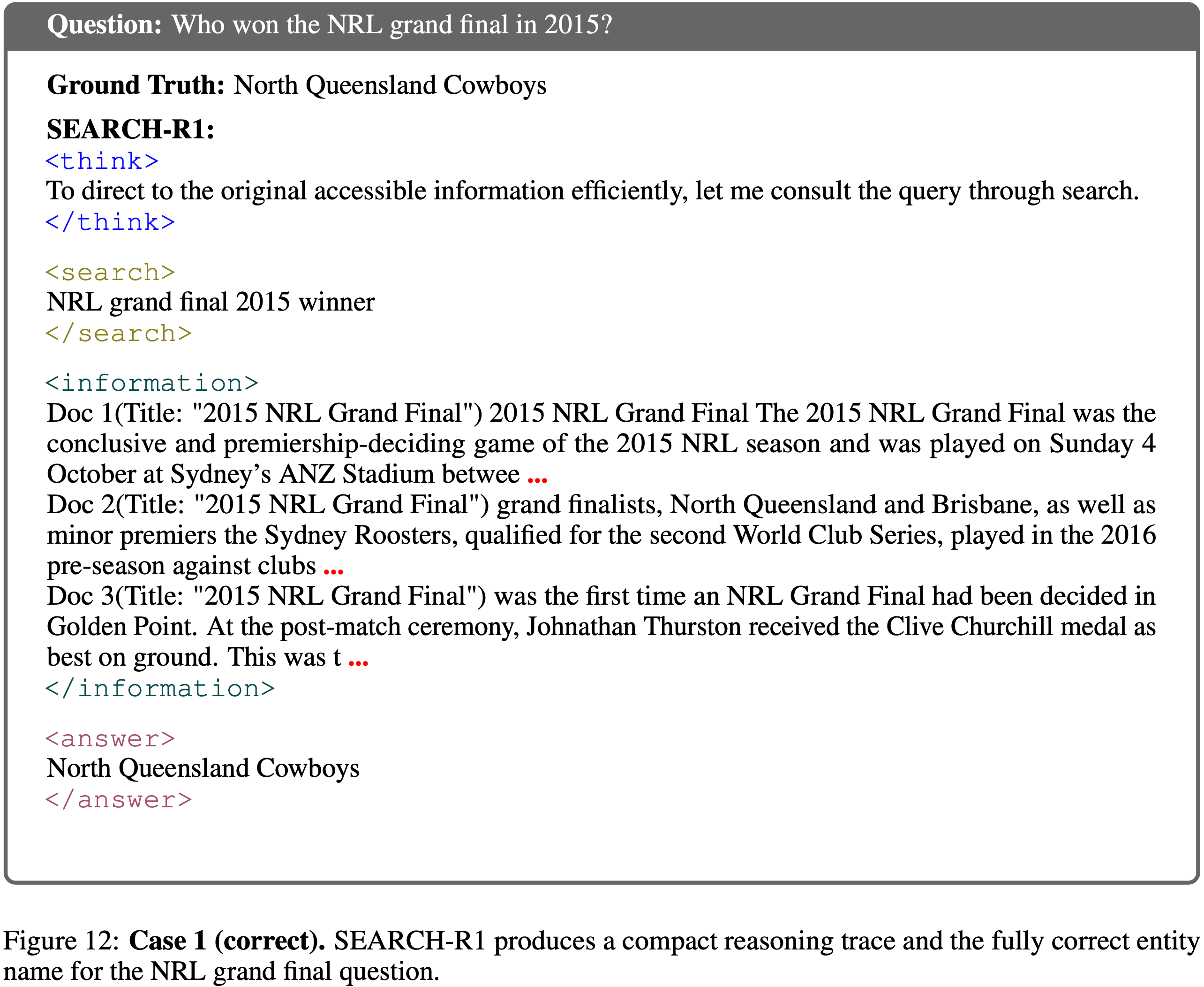- 图 12 和图 13 展示了问题“Who won the NRL grand final in 2015?”的两个推演过程