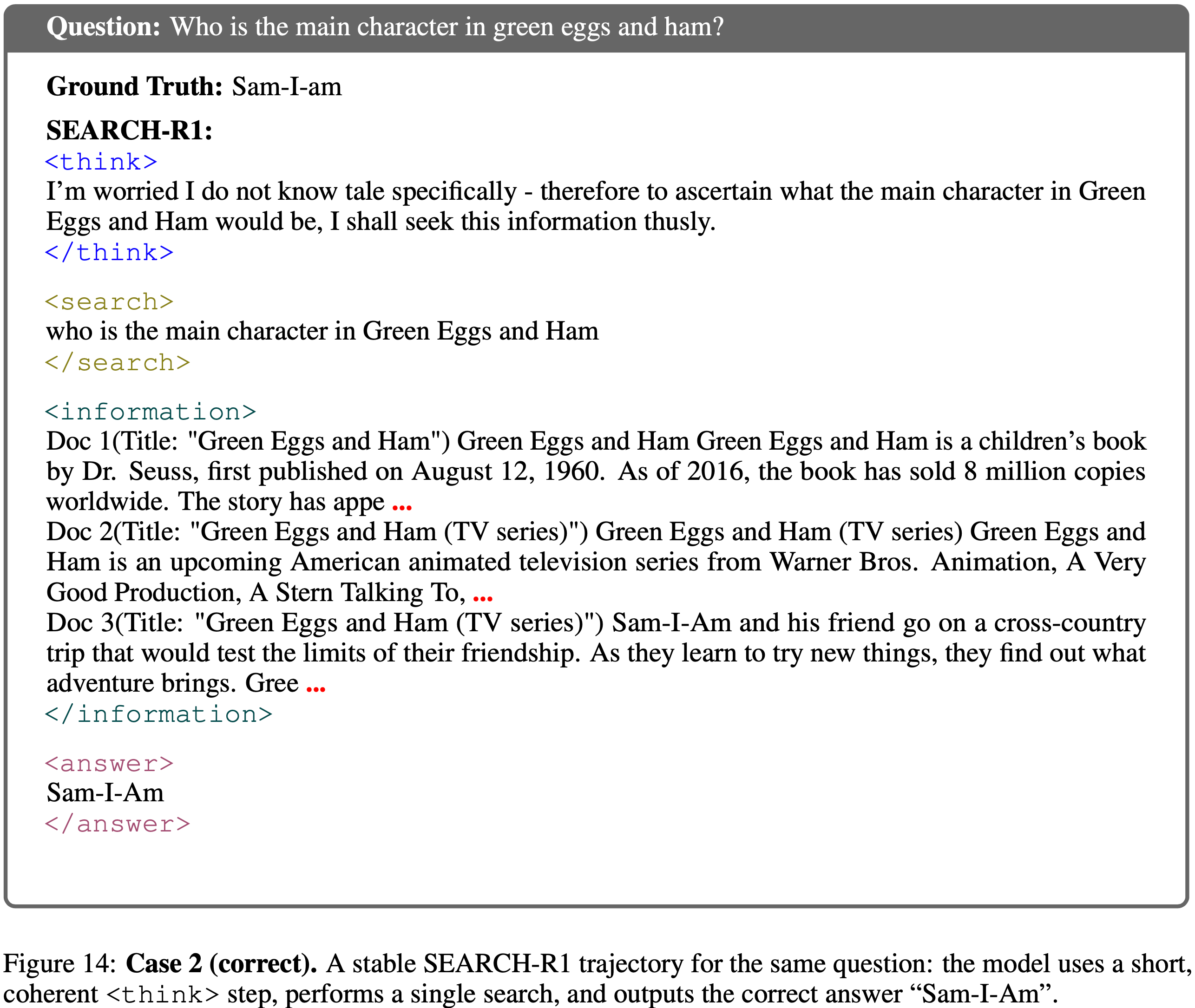 - 相比之下,正确的轨迹保持简短且高置信度,执行单次搜索后给出正确答案“Sam-I-Am”