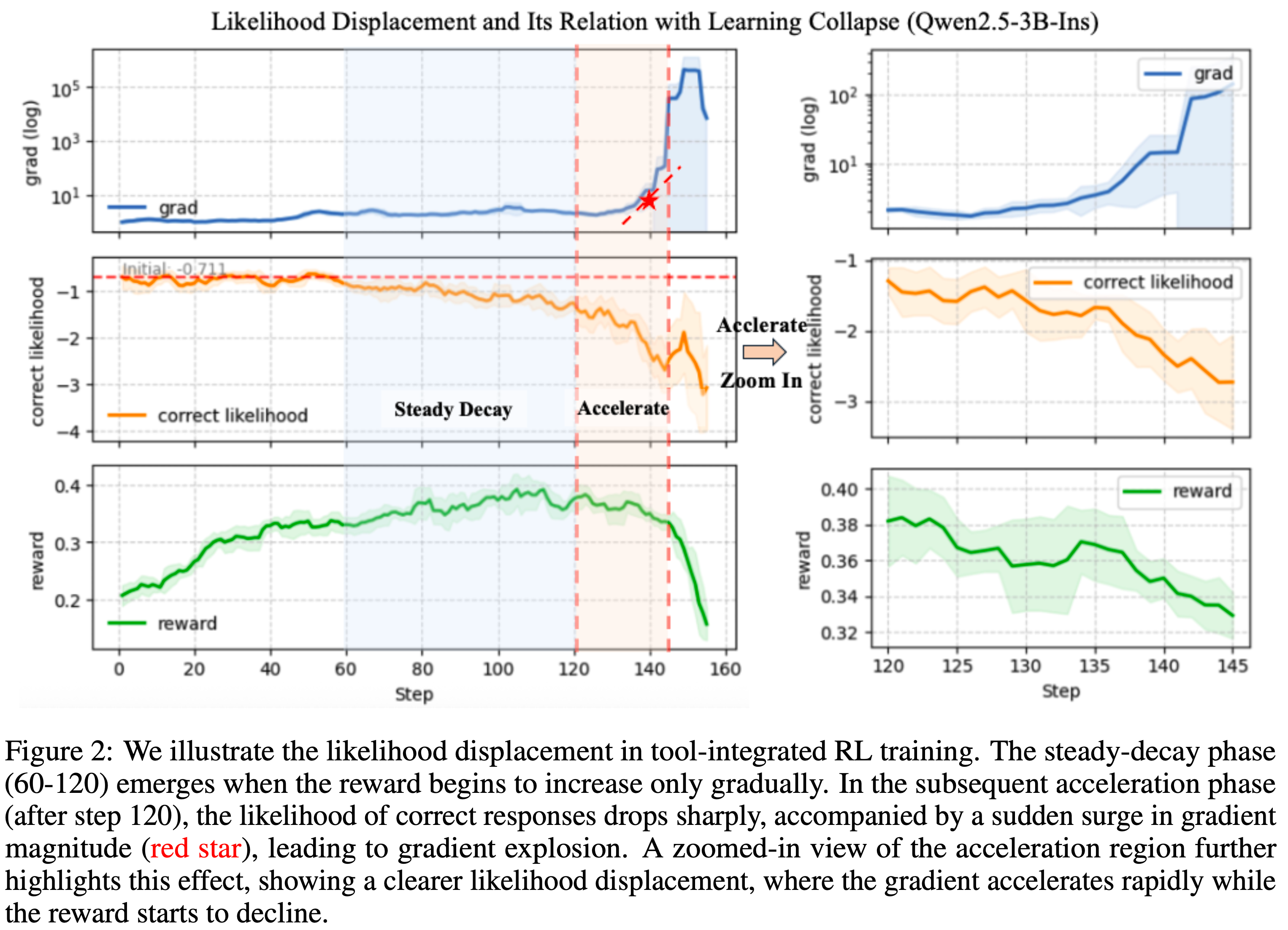 - 论文进一步证明 LLD 驱动了一个 self-reinforcing 的LLD 死亡螺旋 ,其中由此产生的低置信度状态放大了来自错误轨迹的负梯度影响,加速了似然衰减,触发了熵(Entropy)尖峰,增大了似然比,并最终导致了引起坍缩的大梯度不稳定性