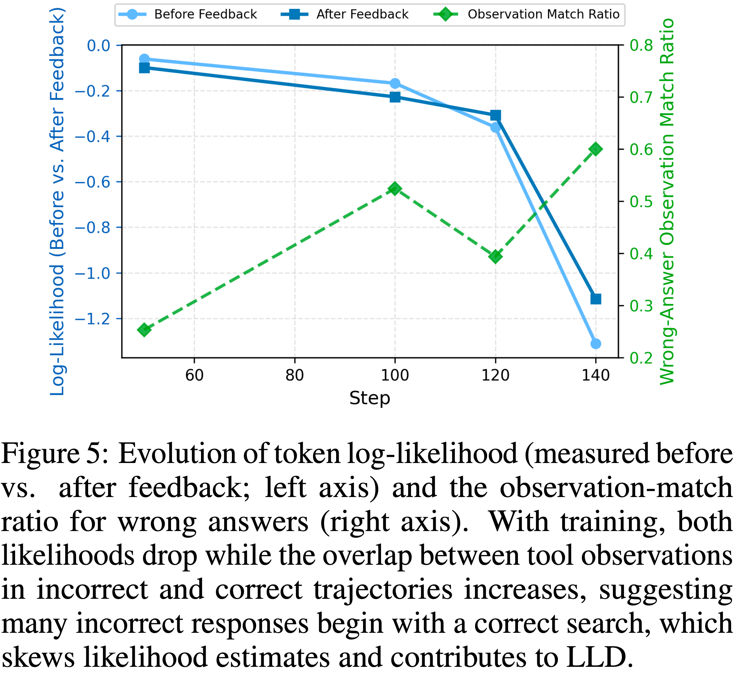 - 总之,这些示例具体地展示了低似然度、过长的错误响应如何主导梯度并驱动 LLD 死亡螺旋,即使环境偶尔将模型推回有效的工具使用