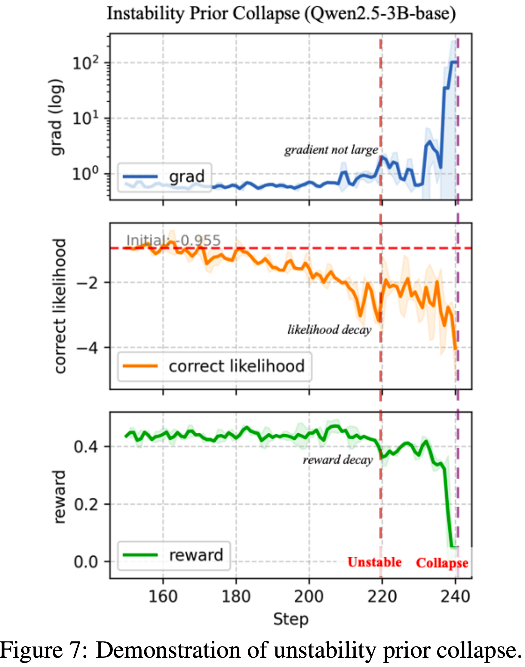 - 稳定的似然衰减,随后是梯度放大和熵爆炸,最终坍缩