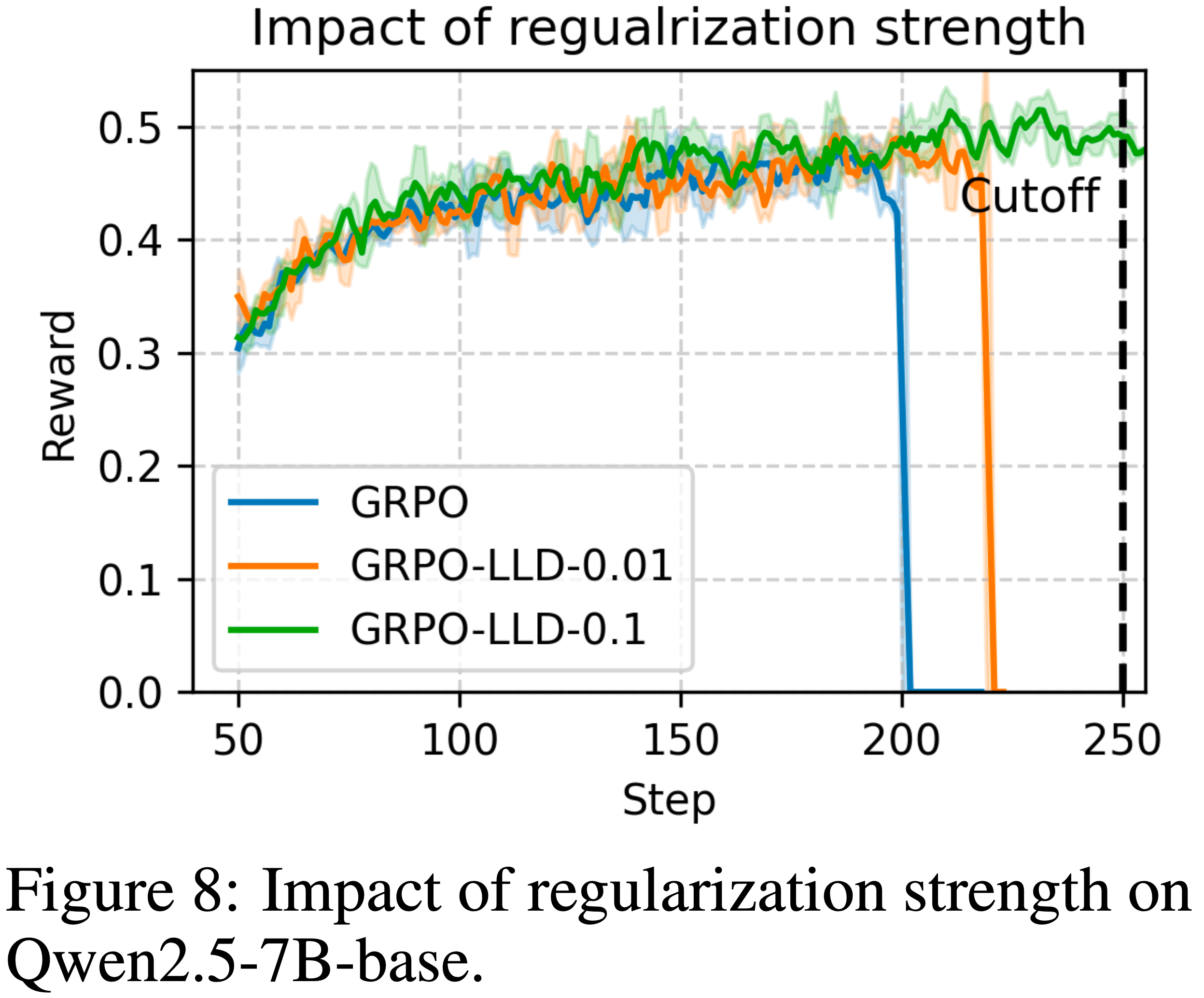 - “GRPO + LLDS-MA”变体(绿色曲线)展示了一种独特的新兴行为