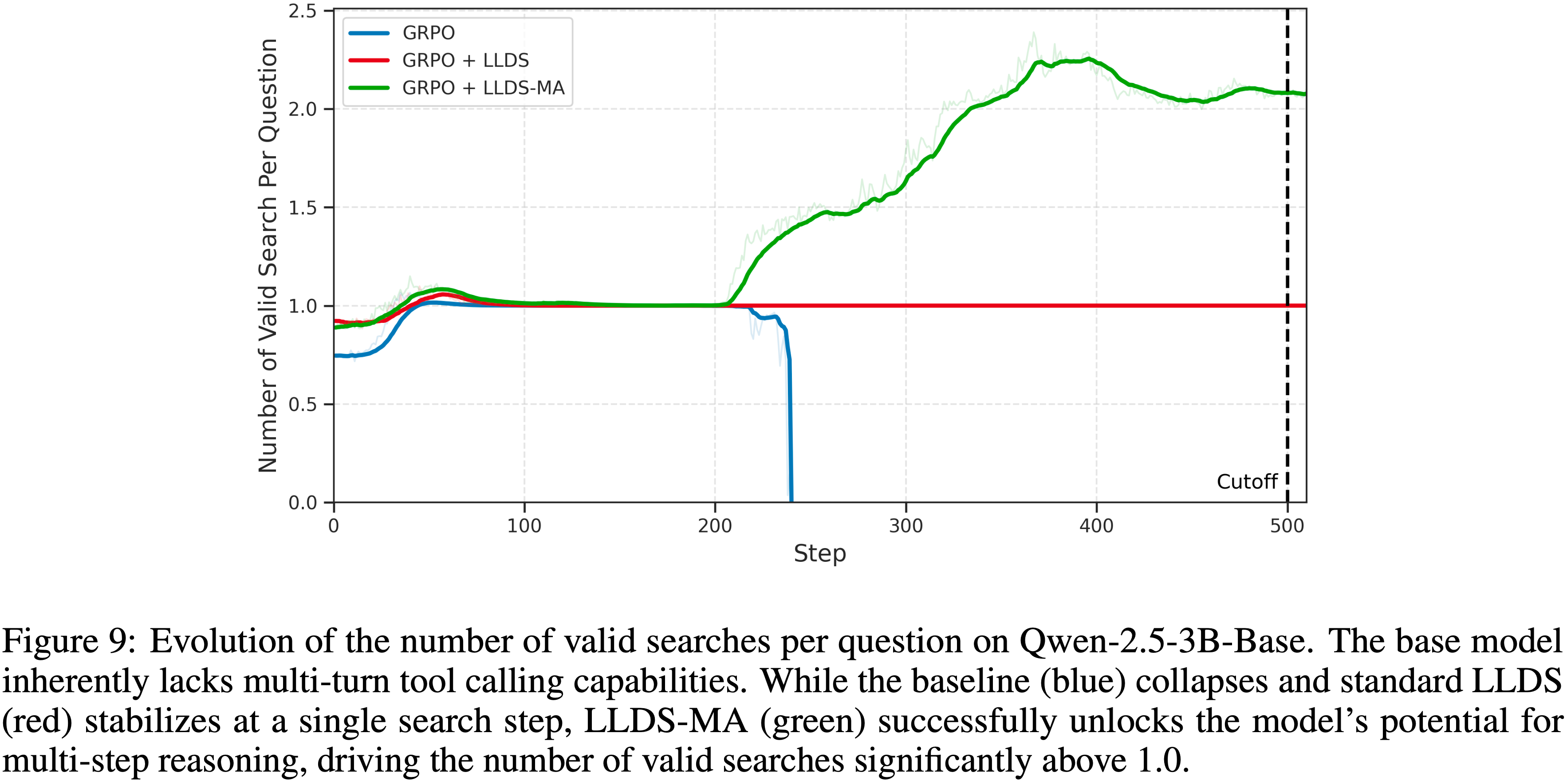 - 虽然标准的 GRPO + LLDS(红色曲线)成功地稳定了训练并防止了崩溃,但它未能引发任何多步行为,搜索频率停滞在恰好 1.0