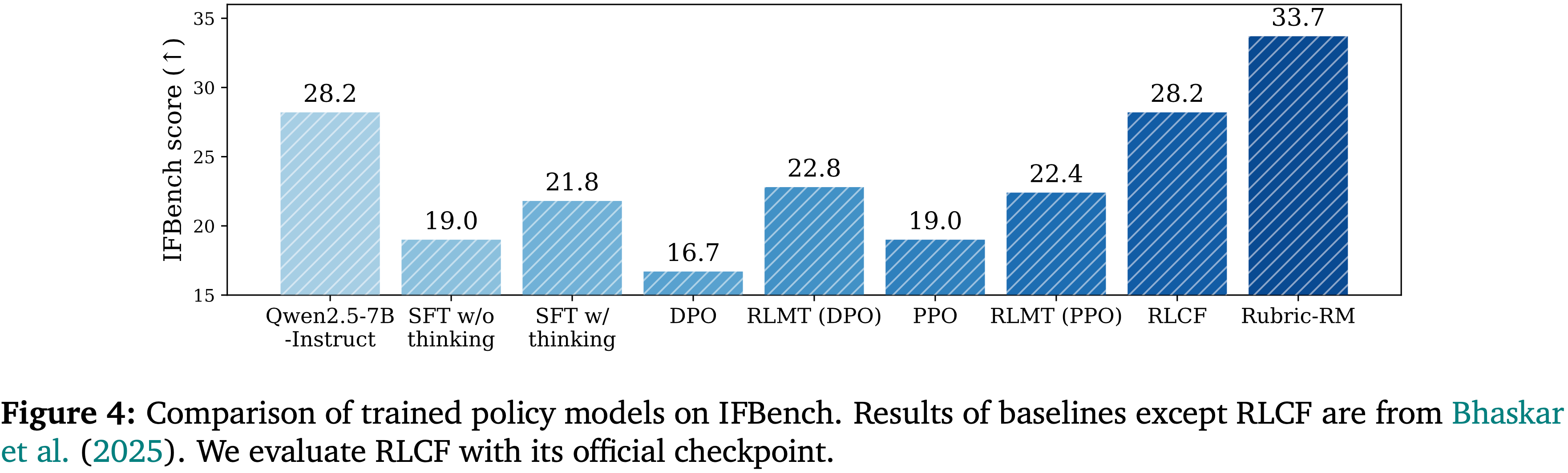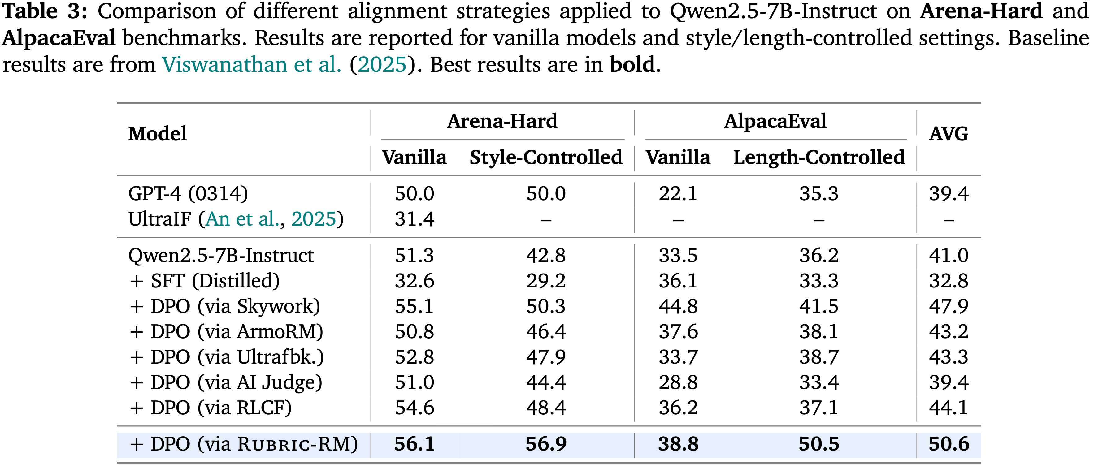 • 论文提出的 rubric 奖励模型 Rubric-RM 始终以 6.8% 的优势超越强基线