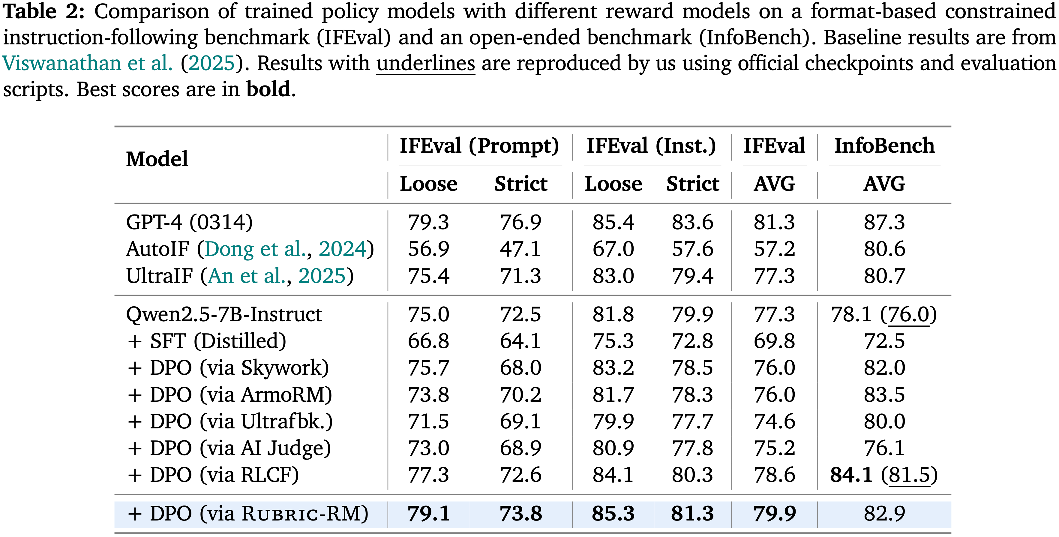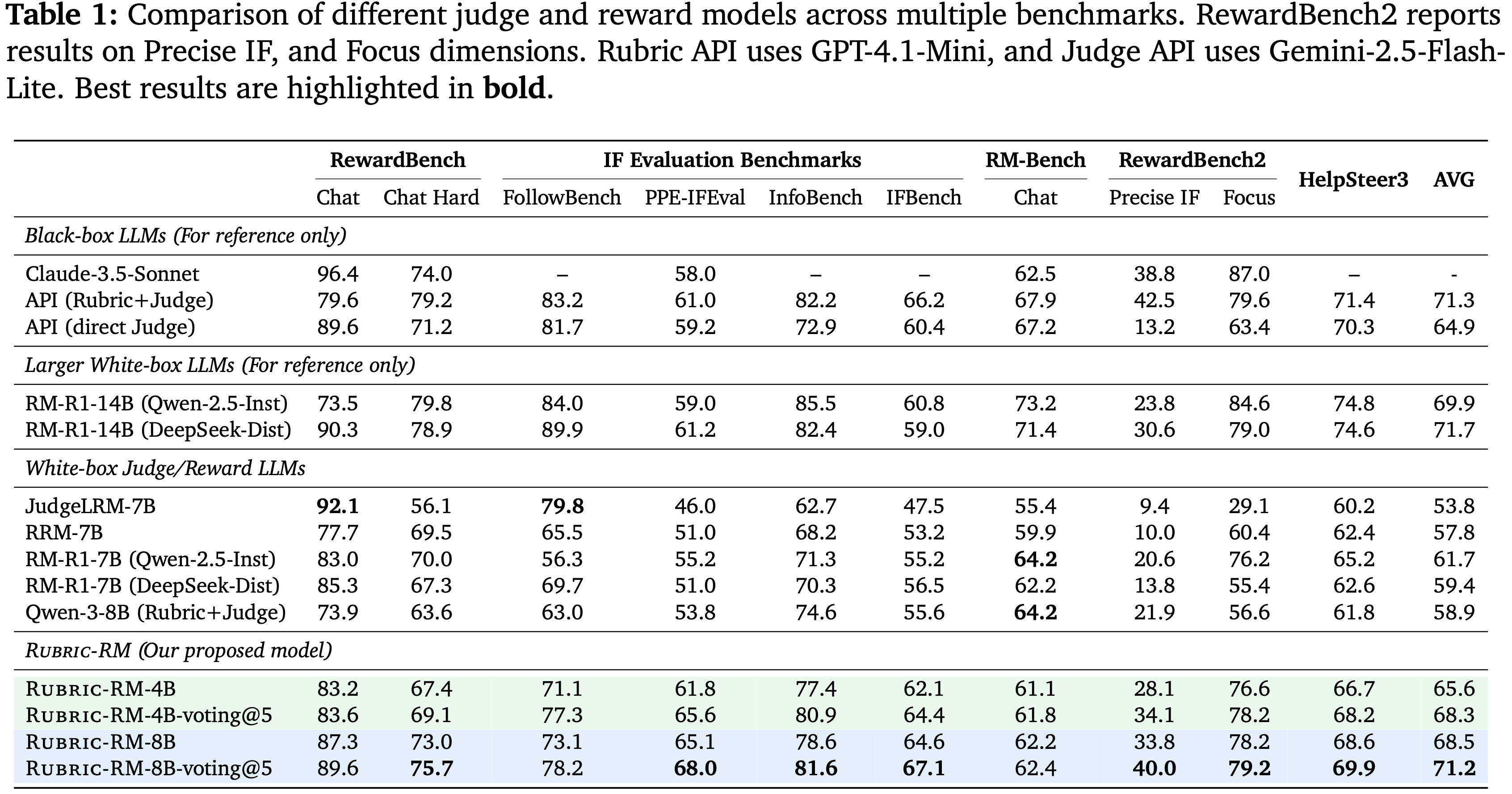 • 在多个奖励建模基准测试中 ,论文 Rubric-based 的奖励模型 Rubric-RM 超越了强规模匹配基线 6.8%