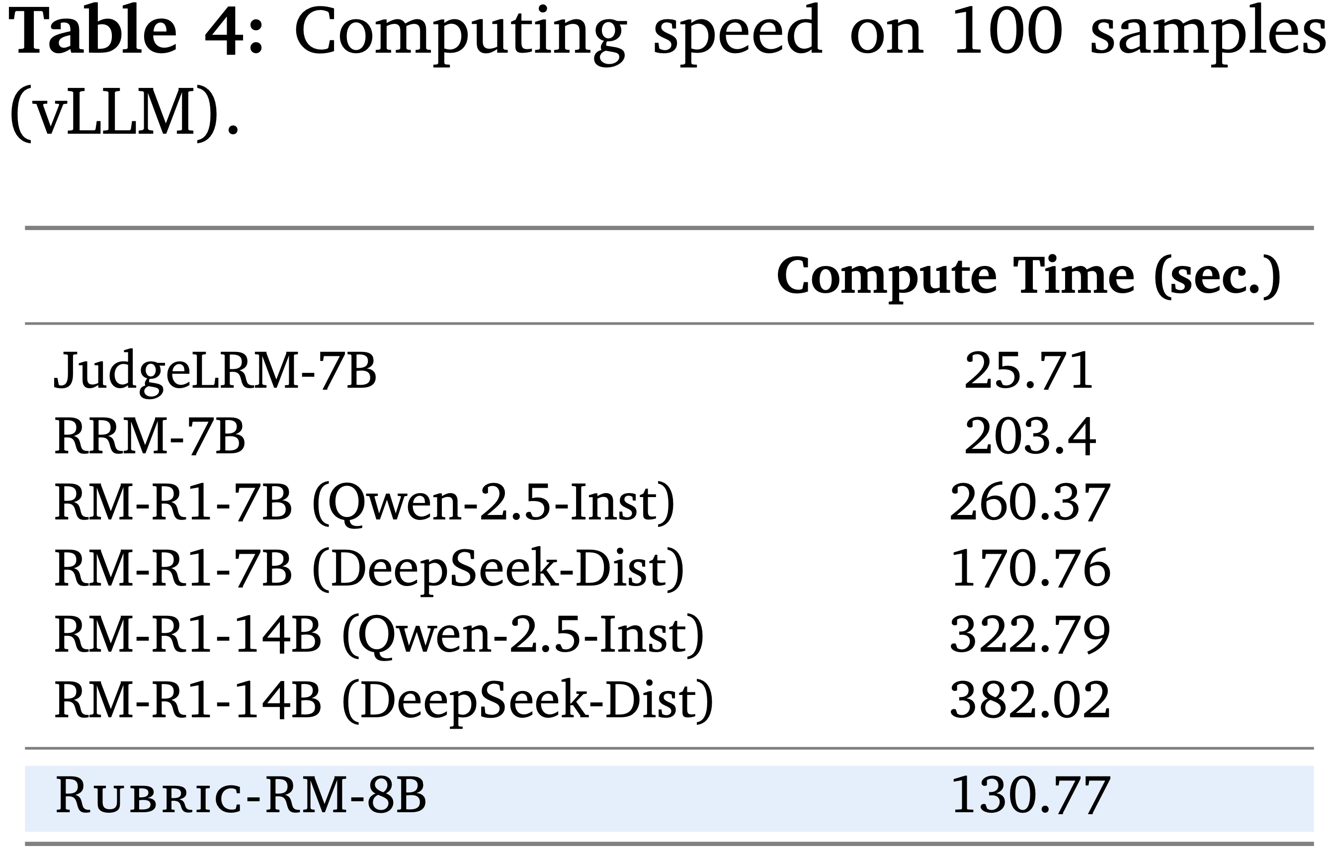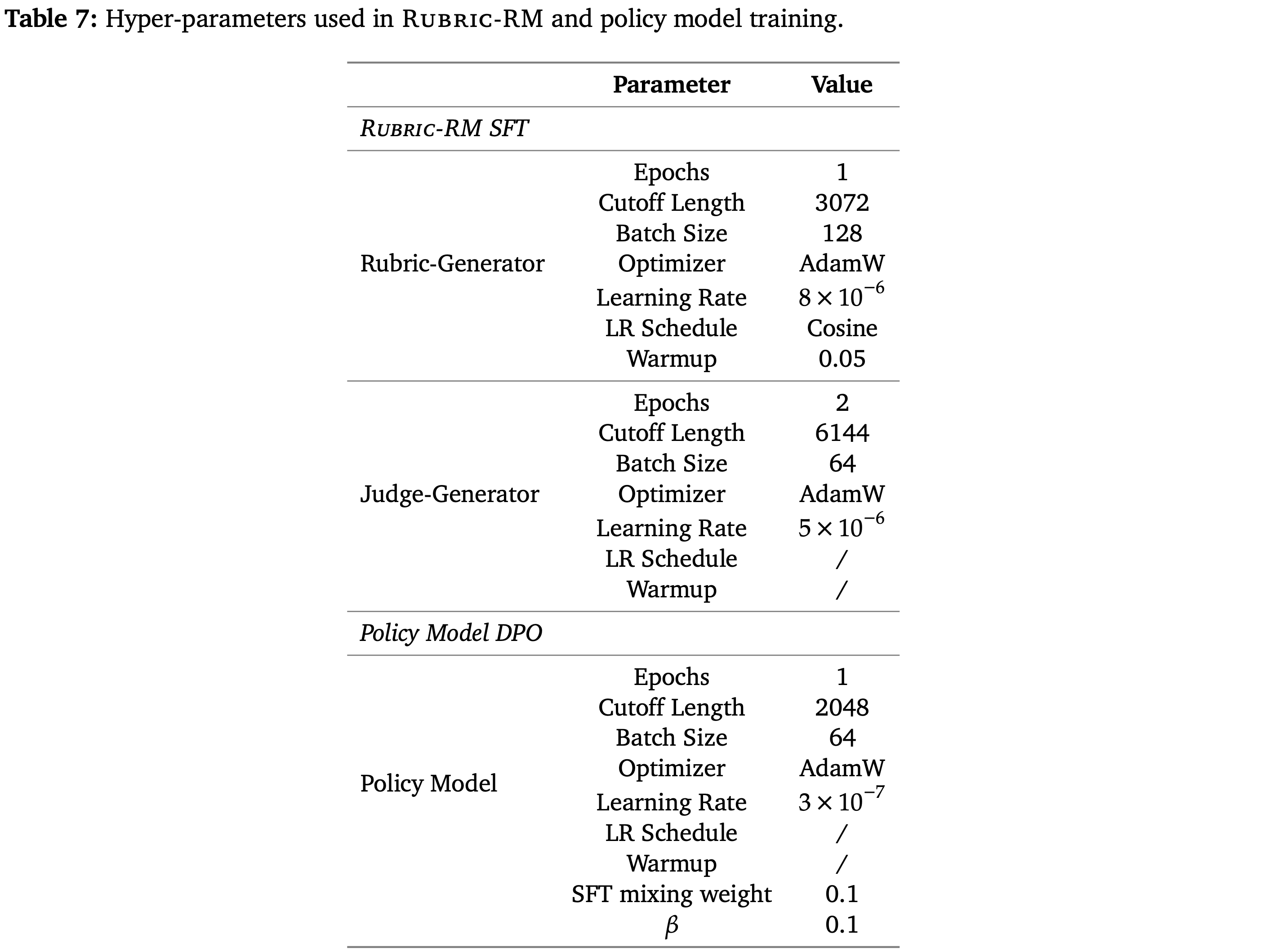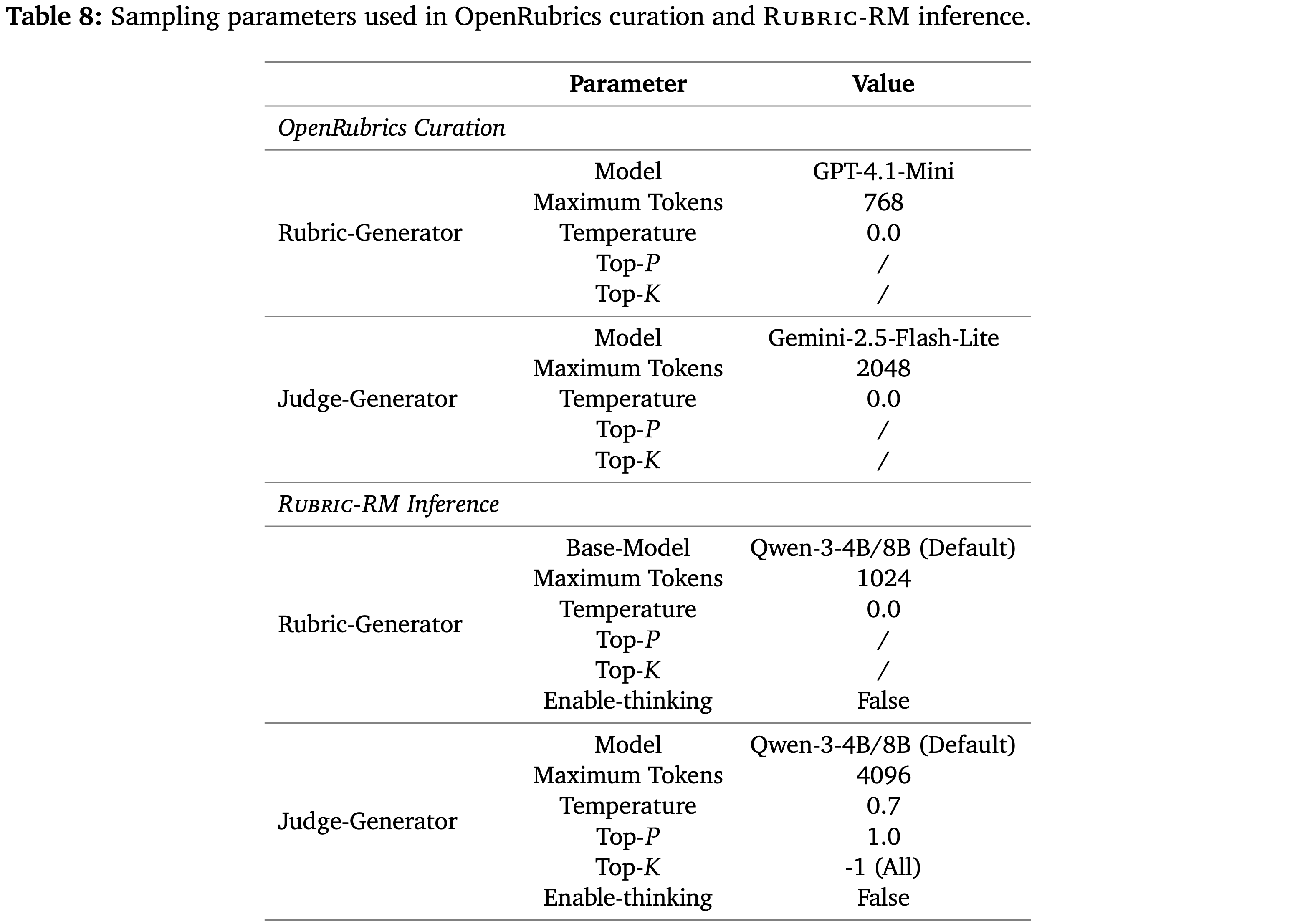 • 注意:Rubric-RM 的 Rubric 生成不需要 Chosen 和 Rejected Response,训练 Rubric-RM 的 生成模型时使用了 OpenRubrics 的 Prompt 和 Rubrics 数据,没有使用 Chosen 和 Rejected