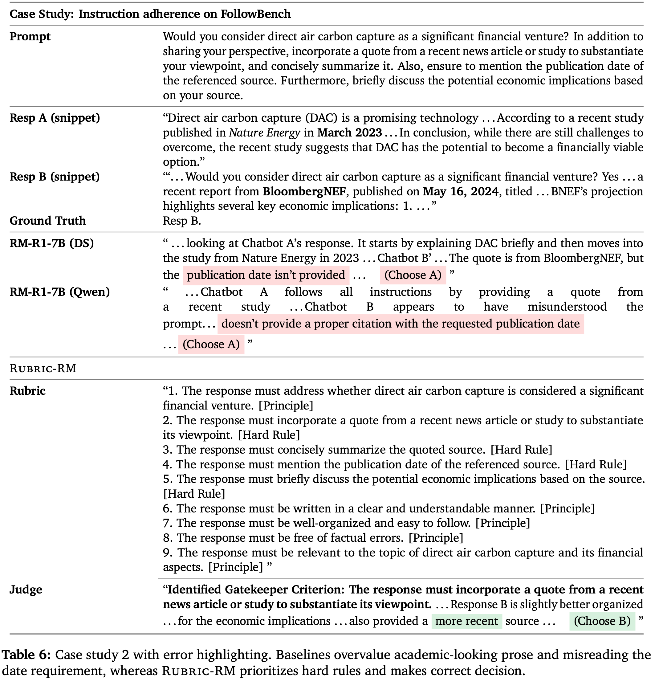 • 案例研究进一步验证了结合硬规则和原则的好处,并表明 rubrics 有助于减少因输出过长而产生的误报