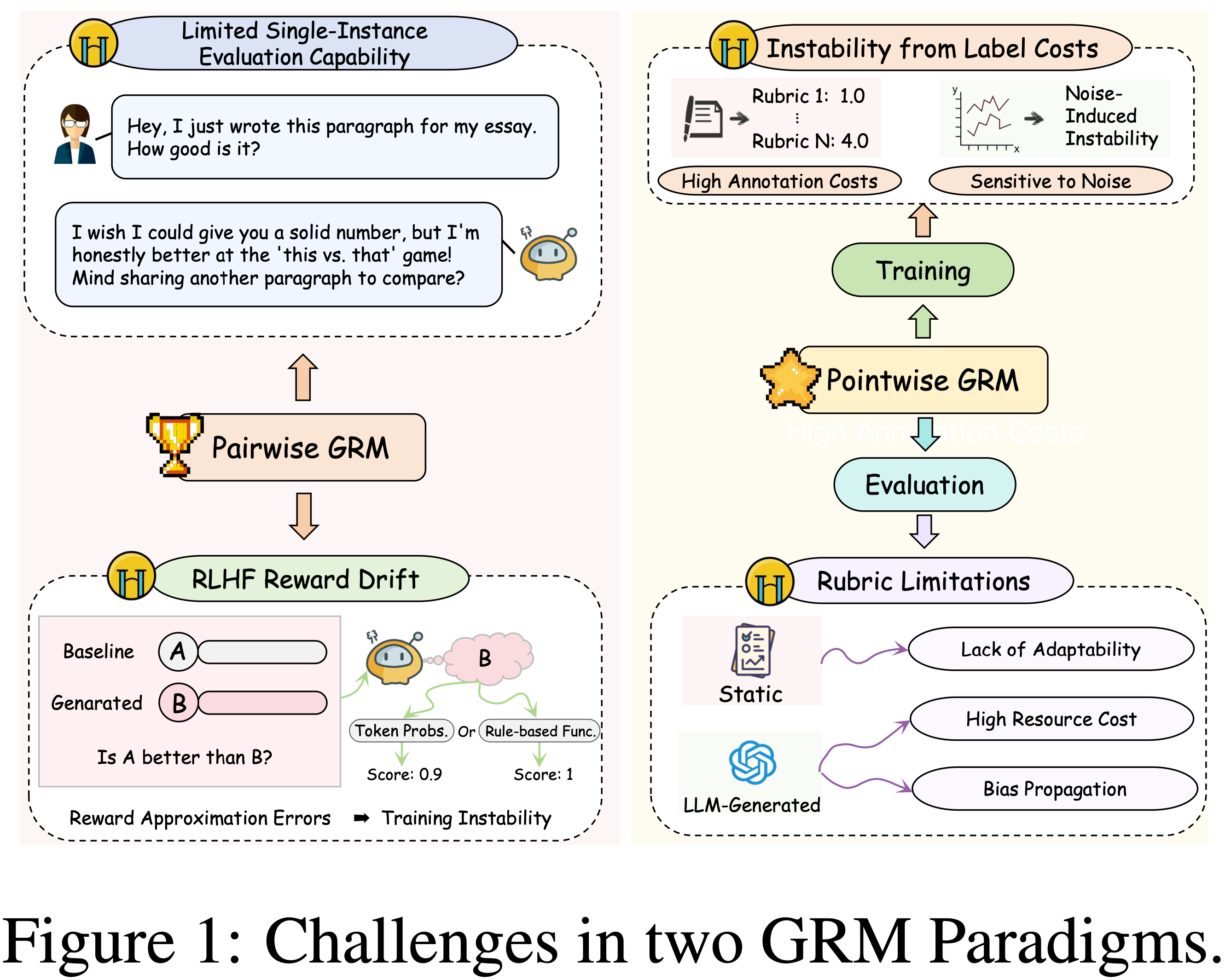 - 第二种是 Point-wise 生成式奖励模型(point-wise GRM) ,它在评估和训练阶段都面临关键限制