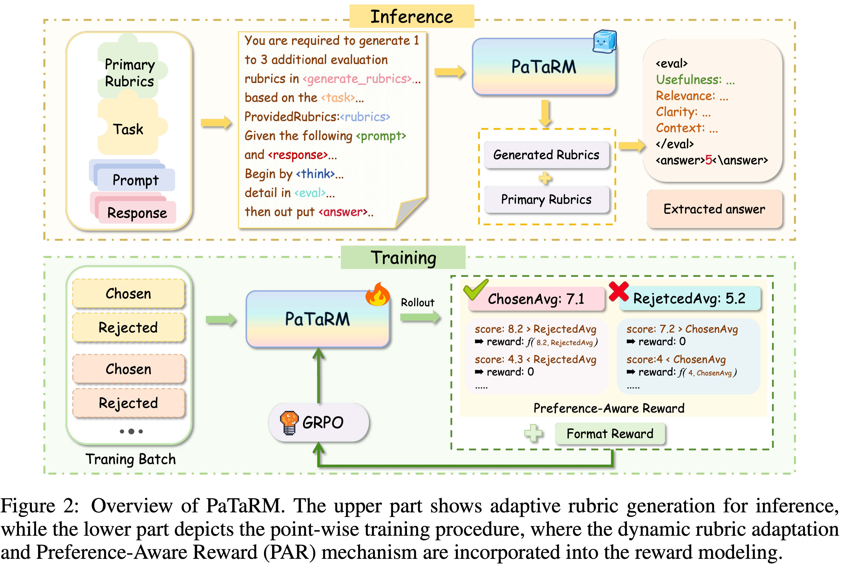 - 图 2 展示了 PaTaRM 的整体流程,它通过偏好感知奖励(PAR)机制和动态 Rubric 适配桥接了 Pairwise 和 Point-wise GRM