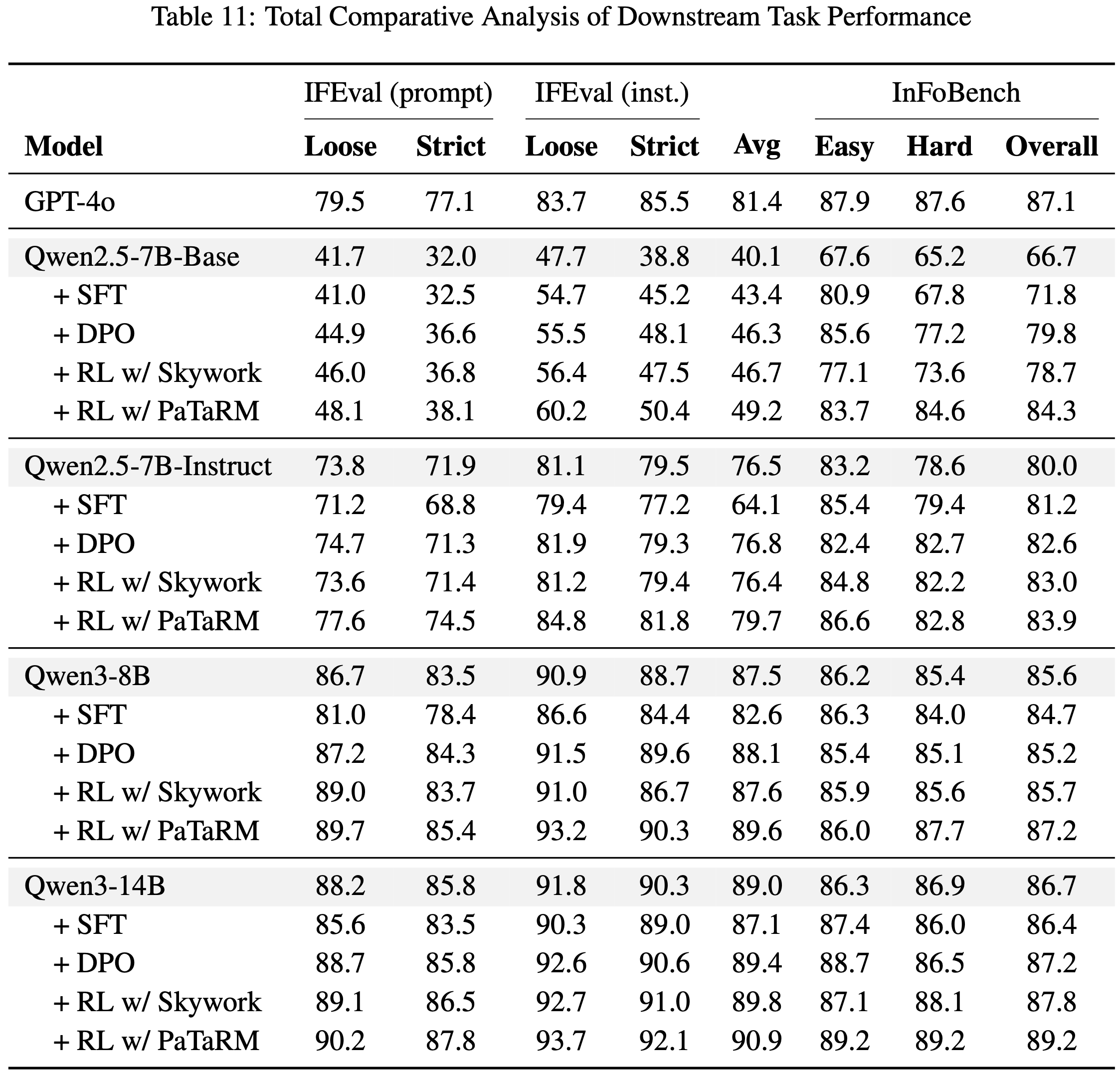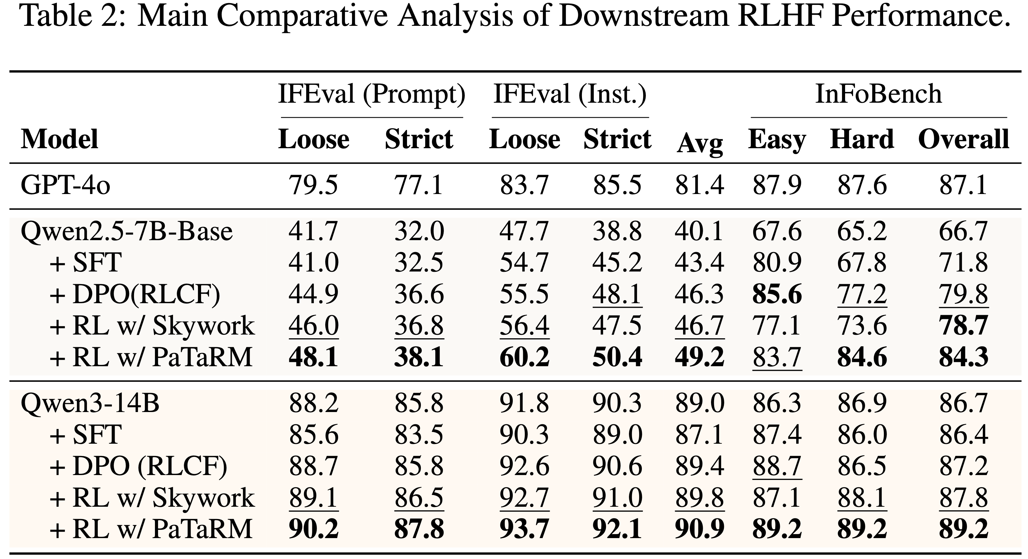 - Furthermore,PaTaRM 提升了下游 RLHF 性能,在 IFEval 和 InFoBench 基准上的平均改进为 13.6%,证实了其有效性和鲁棒性
