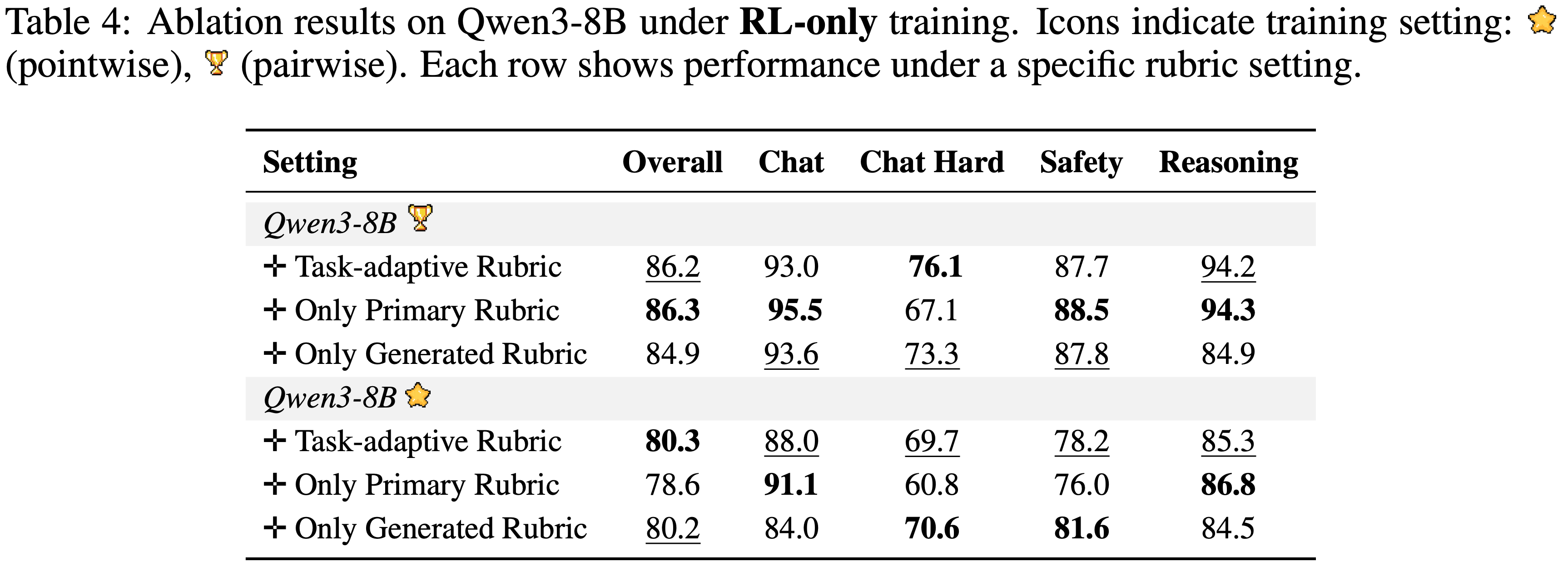 - PAR 机制利用来自 Pairwise 数据的相对偏好信号构建鲁棒的 Point-wise 训练信号,而动态 Rubric 适配则灵活生成针对全局任务一致性和 Instance-specific 推理的评估标准