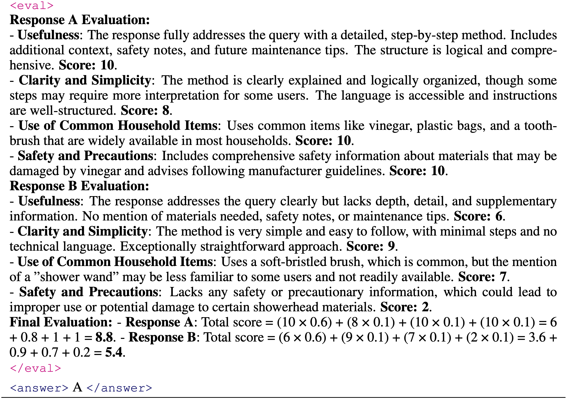 - 该案例涉及一个关于清洁淋浴喷头的用户查询,以及两个质量和完整性各不相同的候选 response