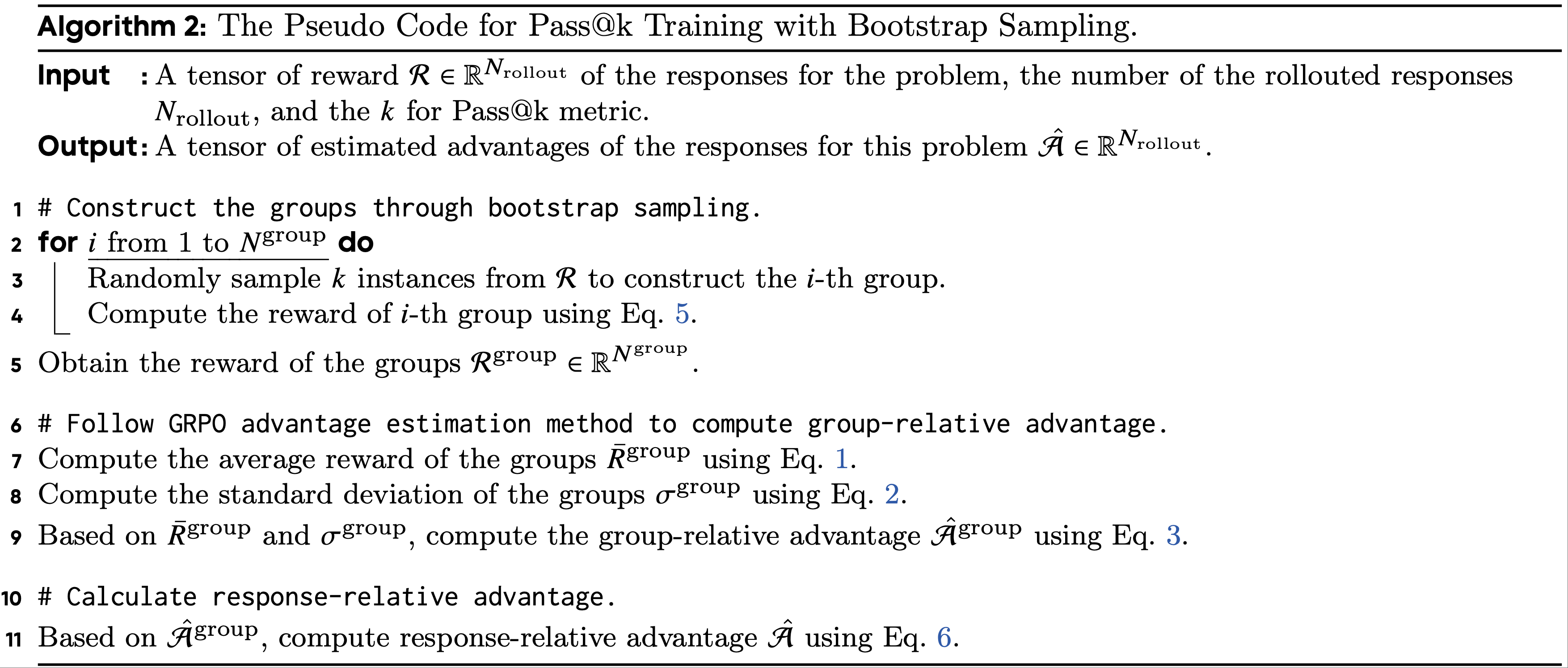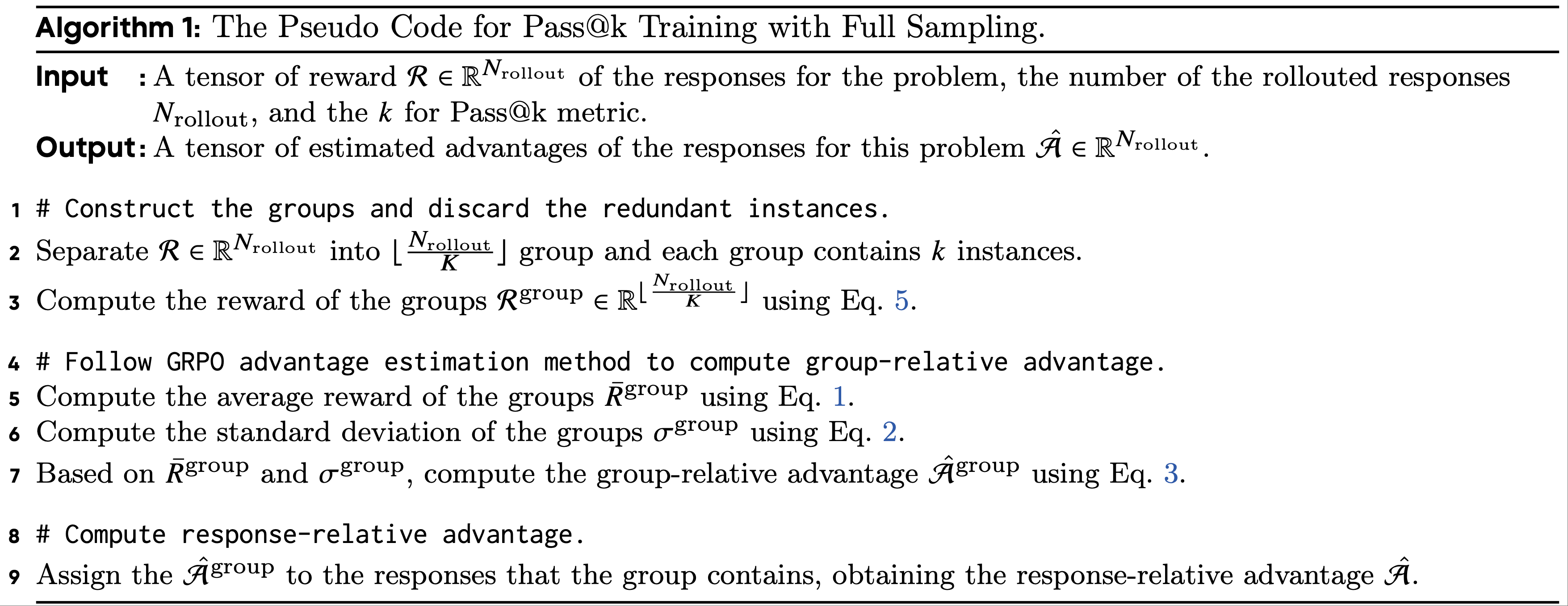 • 输入:问题响应的奖励张量\(R \in \mathbb{R}^{N_\text{rollout} }\)、采样响应数量\(N_\text{rollout}\)以及Pass@k指标中的k