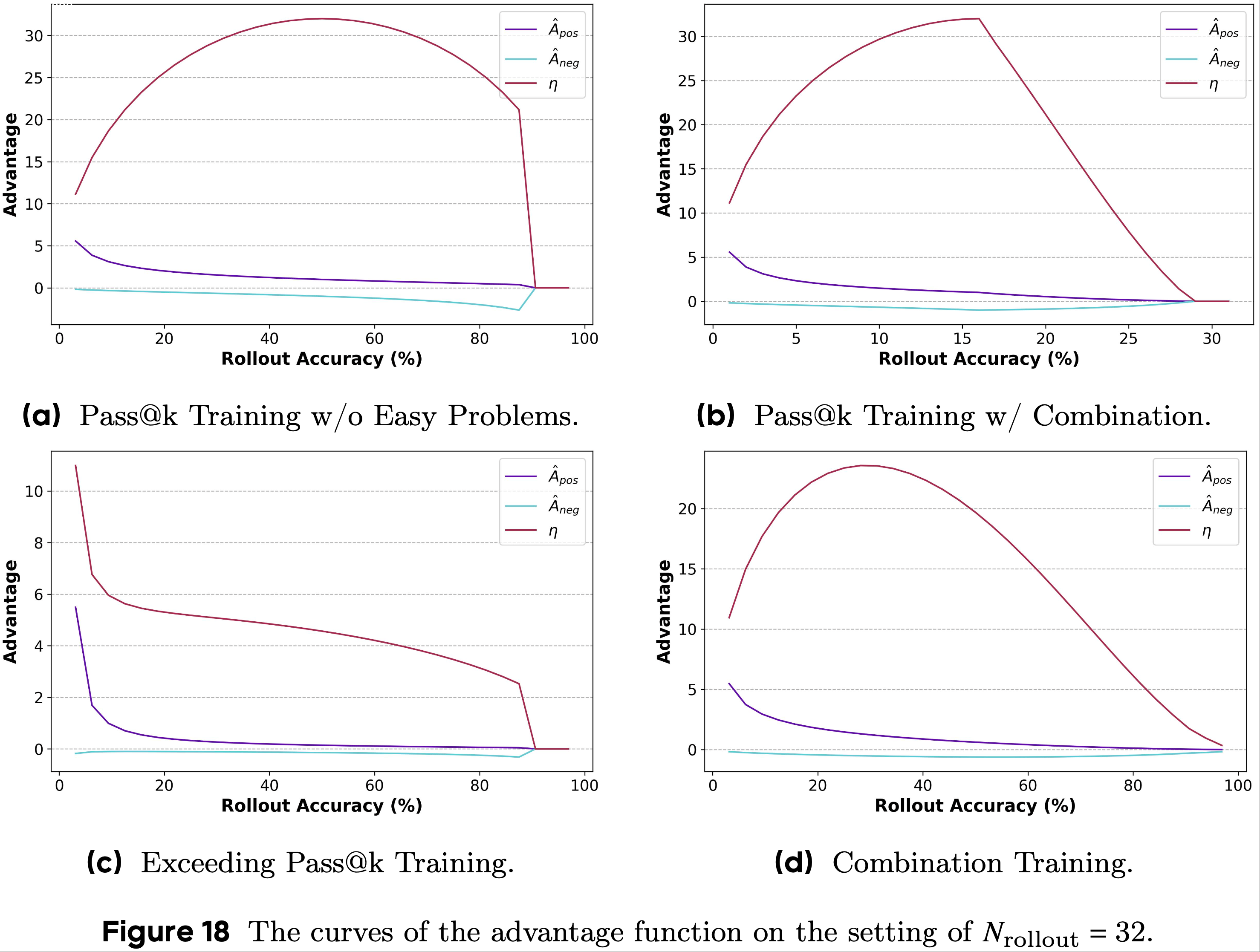 • 论文在图18中展示了不同训练方法的优势函数曲线,包括无简单问题的 Pass@k Training (Pass@k Training w/o easy problems)、带组合的 Pass@k Training (Pass@k Training w/ combination)、超越 Pass@k Training (Exceeding Pass@k Training)和组合训练(Combination Training)