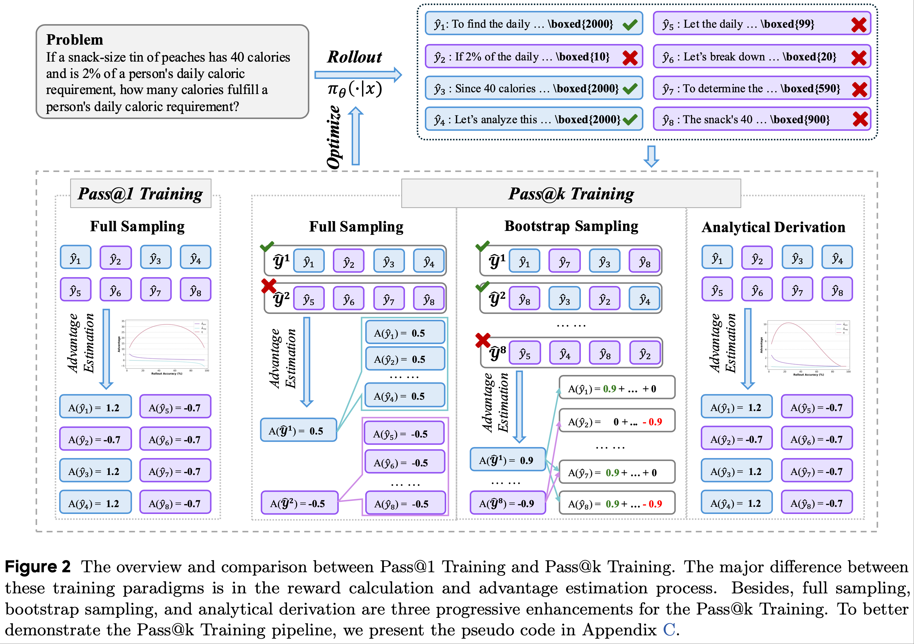 • 为了提高训练效率和有效性,论文引入了 bootstrap 采样机制和优势函数的解析推导,以优化 Pass@k Training 过程