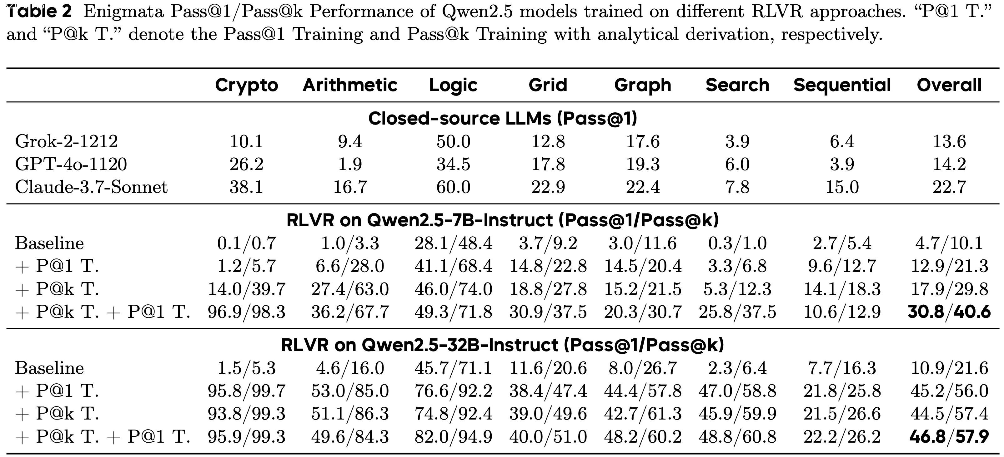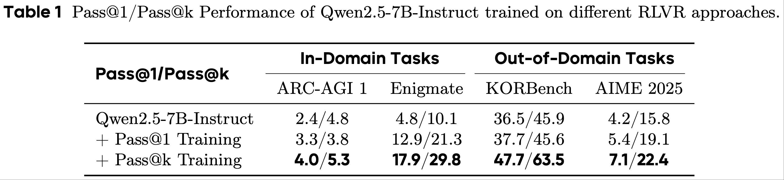 • 在本节中,为进一步验证 Pass@k Training 的有效性,论文提供了通过 Pass@k Training 的各种大语言模型在数学任务(即AIME 2024、AIME 2025和OlymMATH(2025))和合成谜题任务(即Enigmata(2025))上的性能
