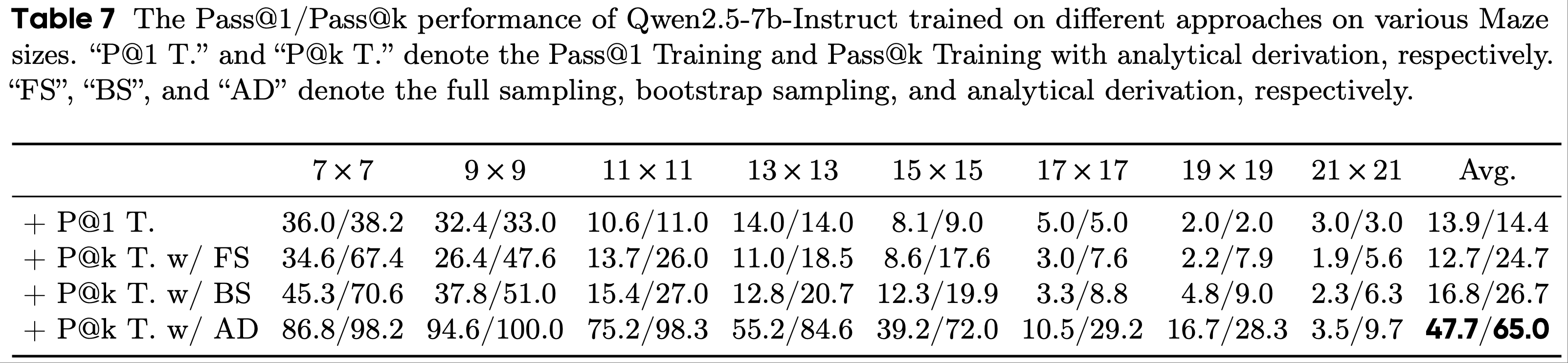 • 在本部分中,论文在表7中展示了 Pass@k Training 在迷宫任务上的完整结果