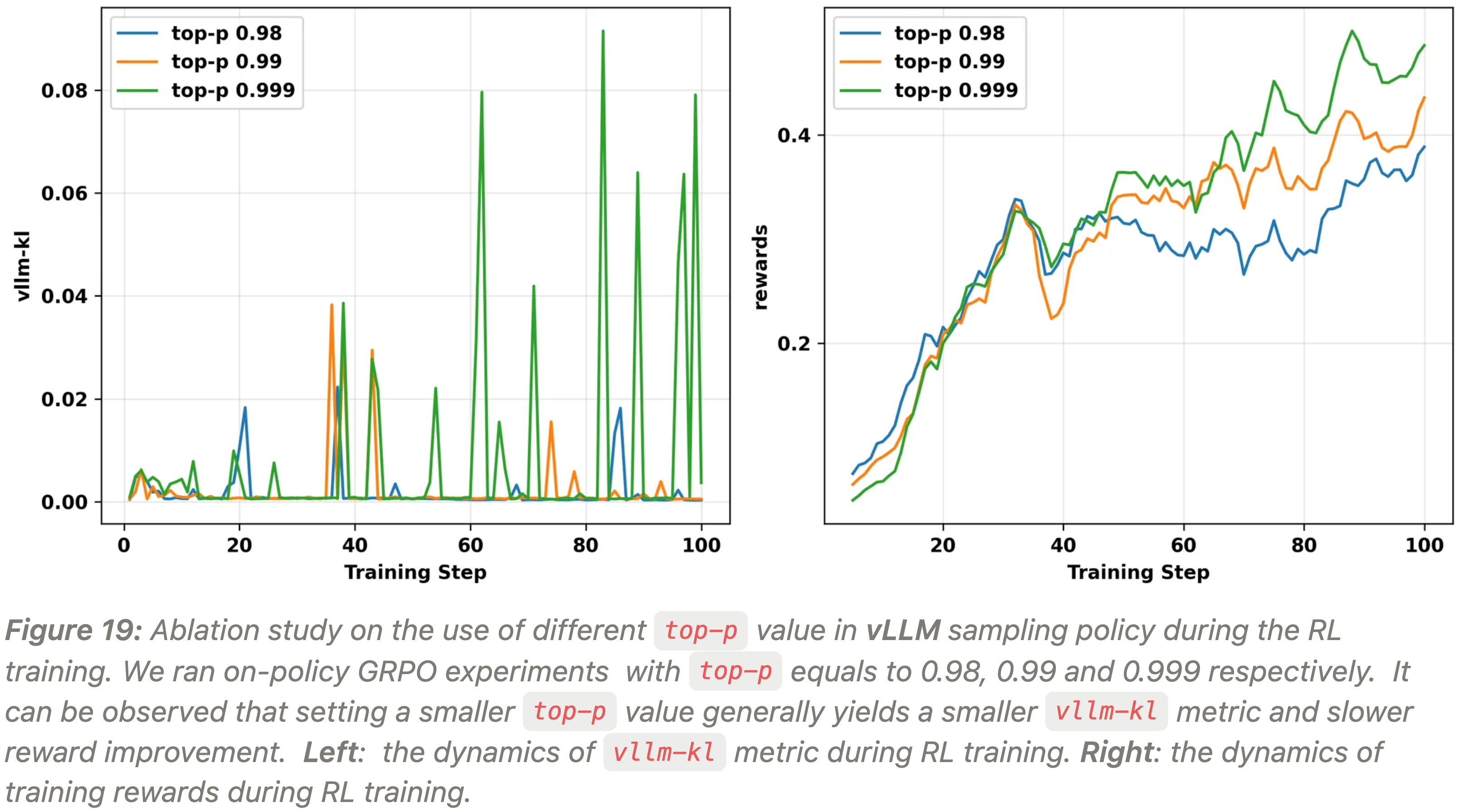 • 通过设置较小的 top-p 值,作者的目标是降低推理阶段出现极低 vLLM 概率 token 的频率 ,从而减轻训练-推理不一致性