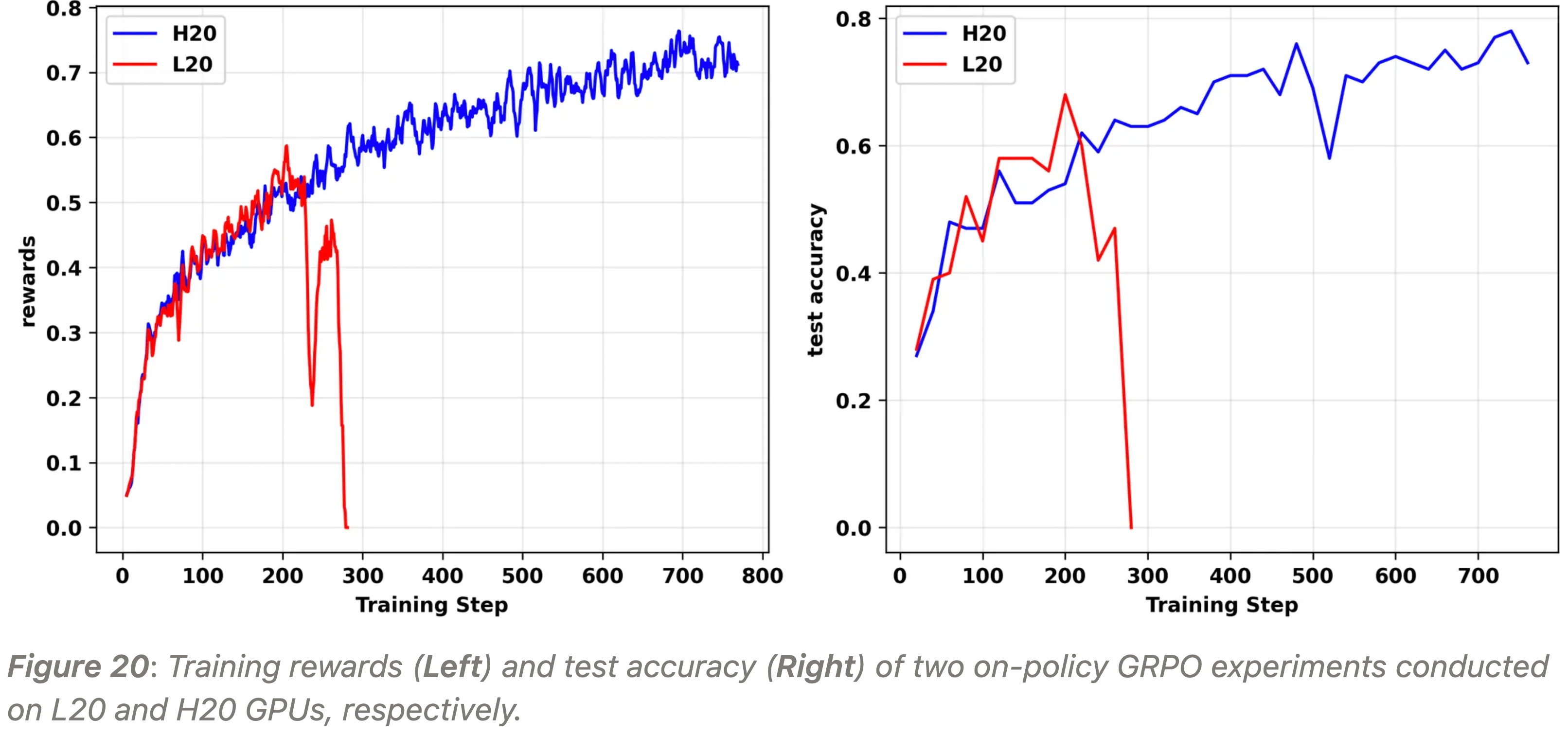 • 图 20 显示了在 L20 和 H20 GPU 上,分别在相同配置下从头开始训练的两个 on-policy GRPO 实验的结果