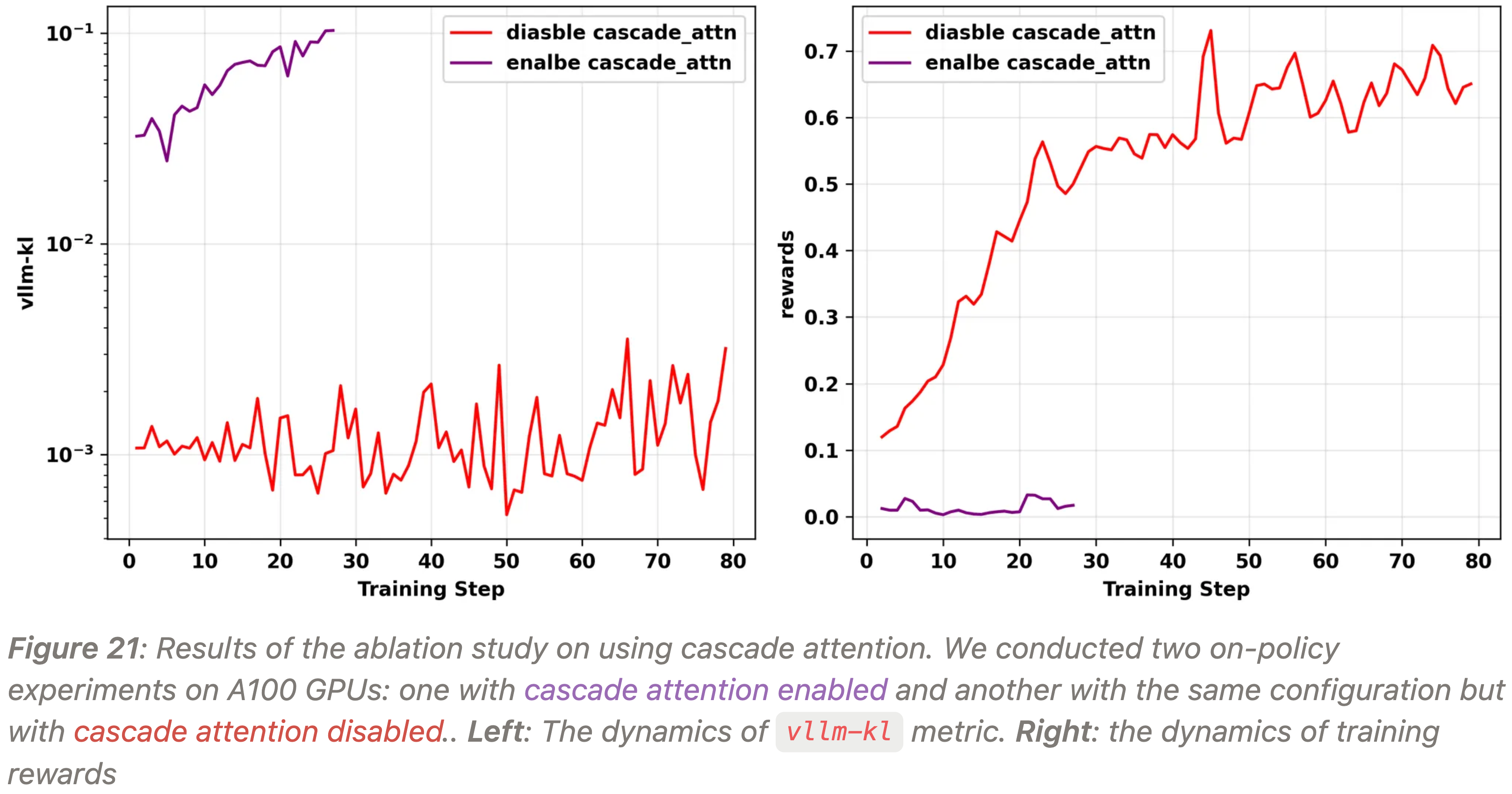 • 根据这个 GitHub issue,作者在初始化 vLLM 引擎时设置了 disable_cascade_attn=True,并发现它在 A100 GPU 上进行的实验中显著有助于减少训练-推理不一致性