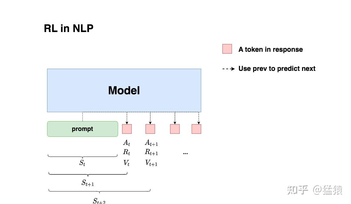$$- 其中,仅在response最后一步 \(t=T\) 时取 \(R_t\) 的值,因为Reward Model训练时也是一整个Response作为一个样本训练的,这也很好理解,因为一次回答中间的结果无法评估好坏,需要整个回答完成后才知道这次Response是否合理