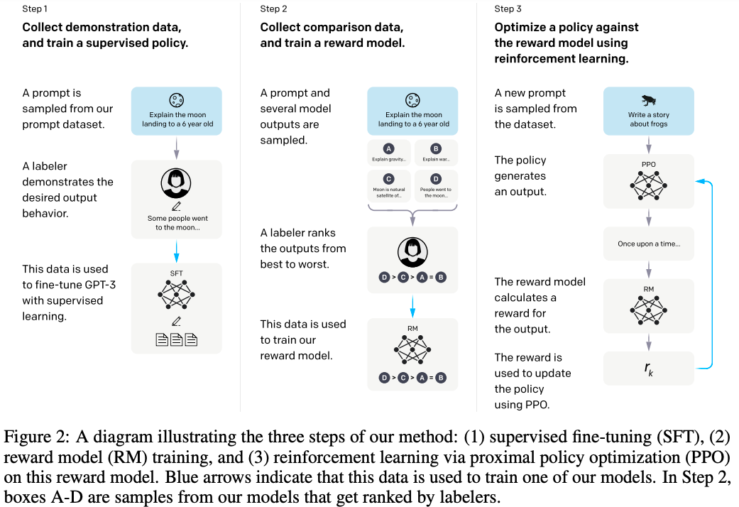 - 训练流程,来自OPENAI原始论文:Training language models to follow instructions with human feedback