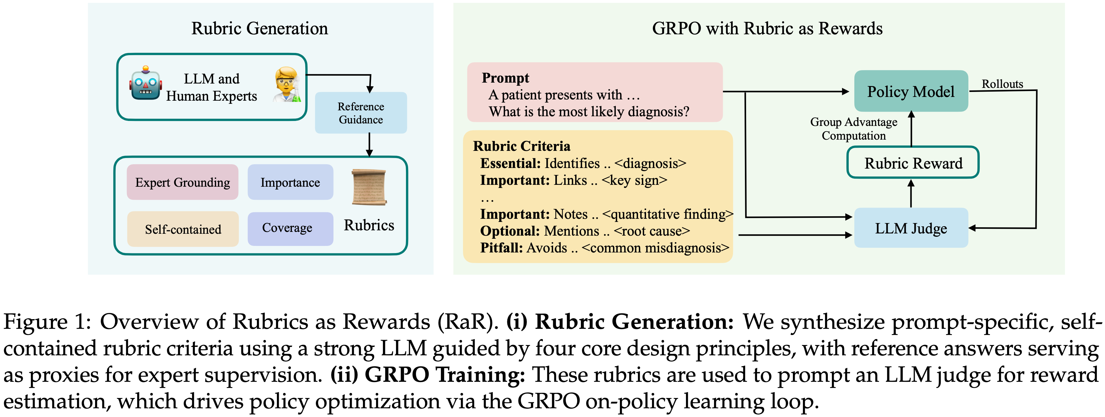 • 一个 Rubric 规定了高质量 Response 的标准,并提供人类可解释的监督