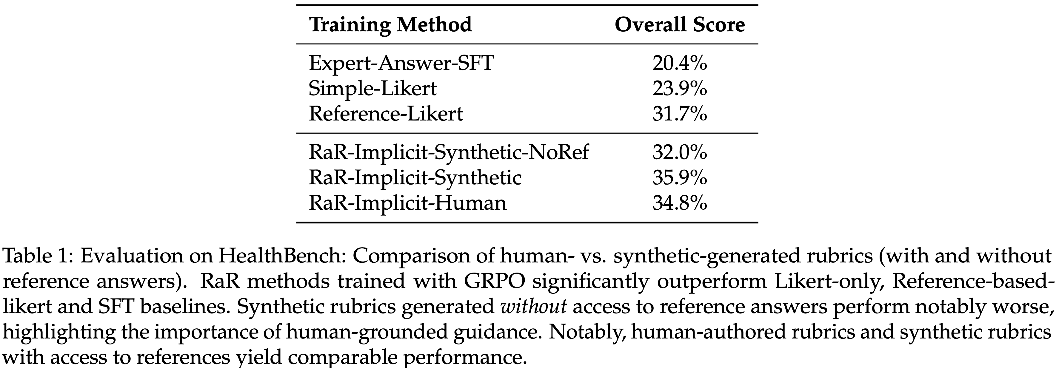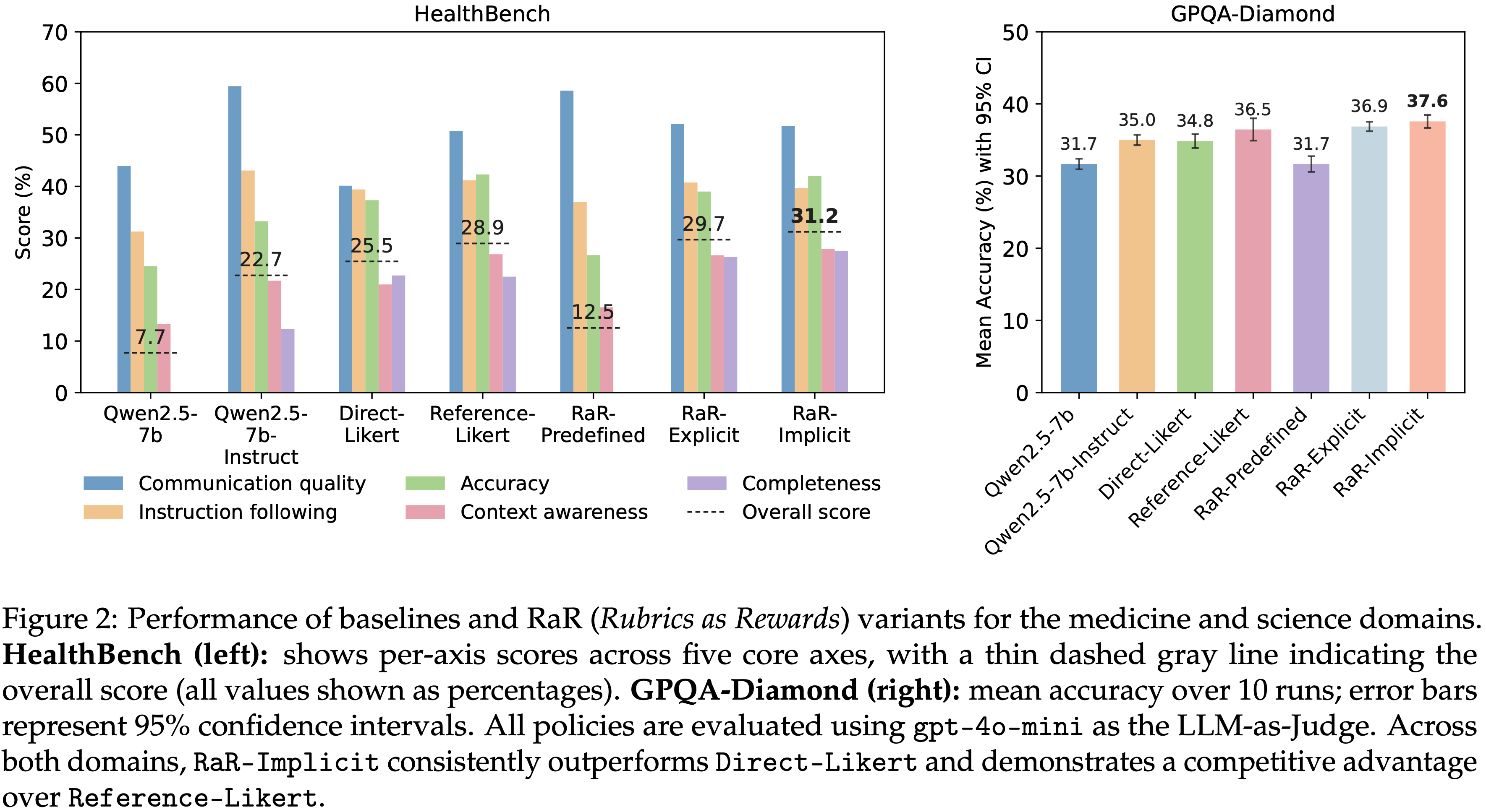 • 最佳的 RaR 变体在 HealthBench 上实现了高达 31% 的相对提升,在 GPQA-Diamond 上相比流行的、依赖直接 Likert-based 奖励的 LLM-as-judge 基线提升了 7%