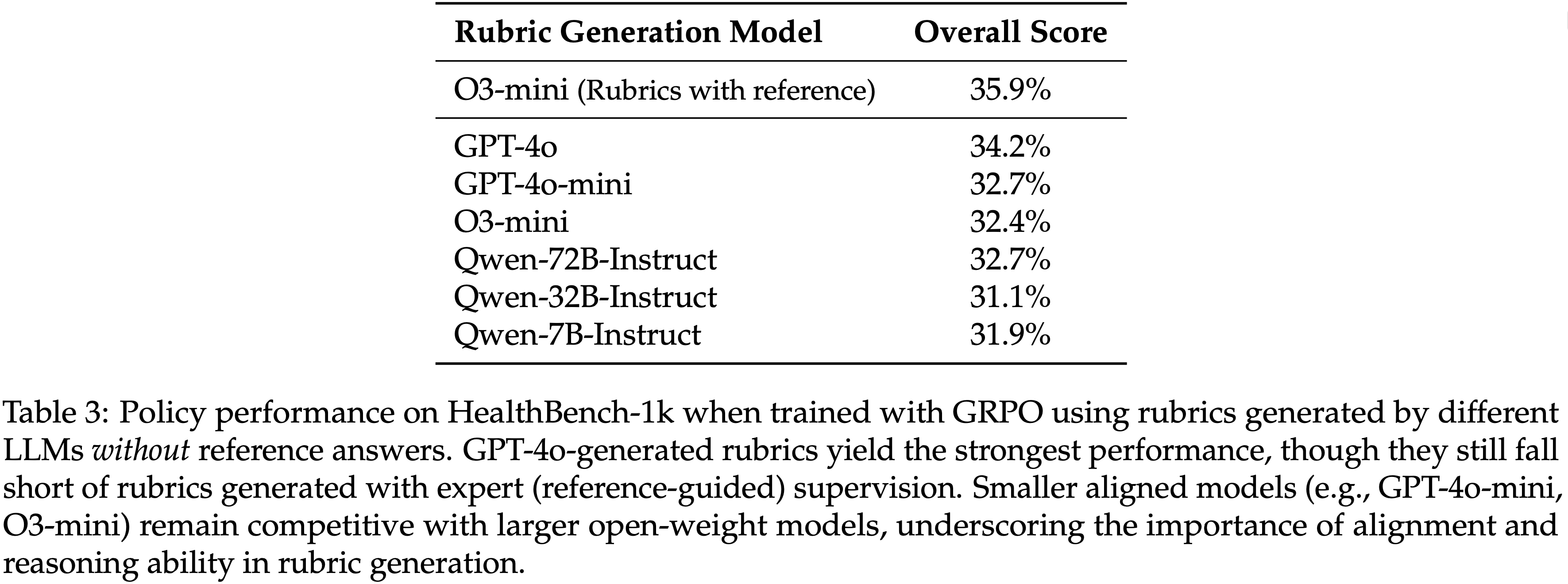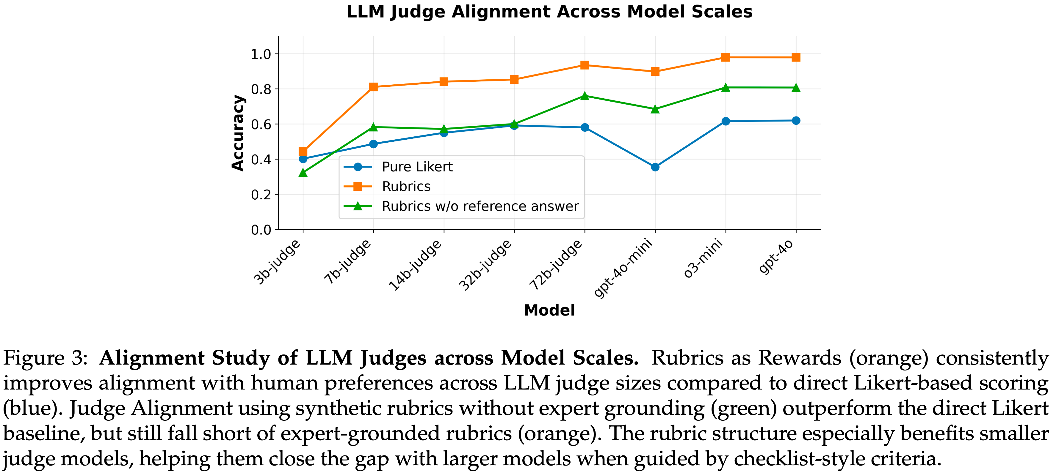 • Moreover,论文发现使用 Rubrics 作为结构化的奖励信号能更好地对齐较小的 Judge 模型,并减少跨不同规模 Judge 的性能方差
