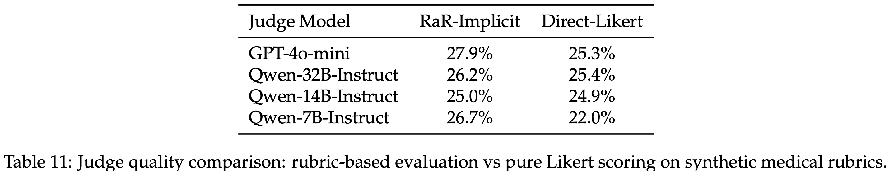• 表 11 报告了 Judge 在合成医学数据上的准确性,所有策略均使用 Qwen2.5-7B 进行训练,并采用不同的 Judge 模型
