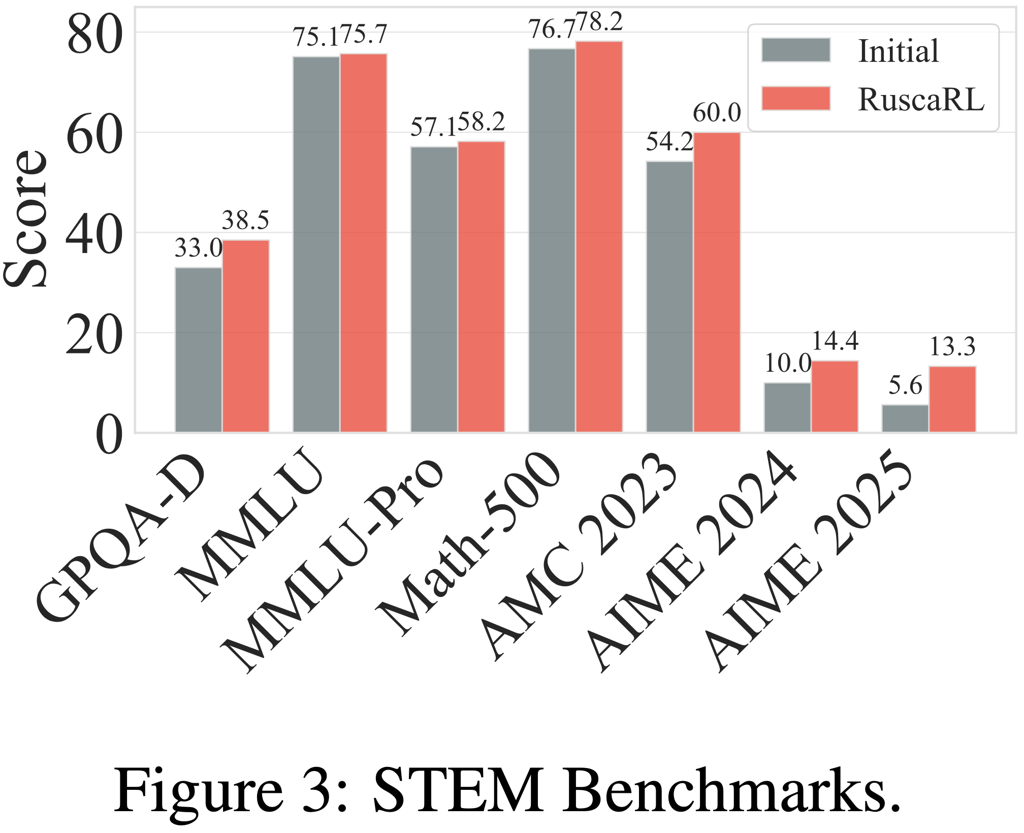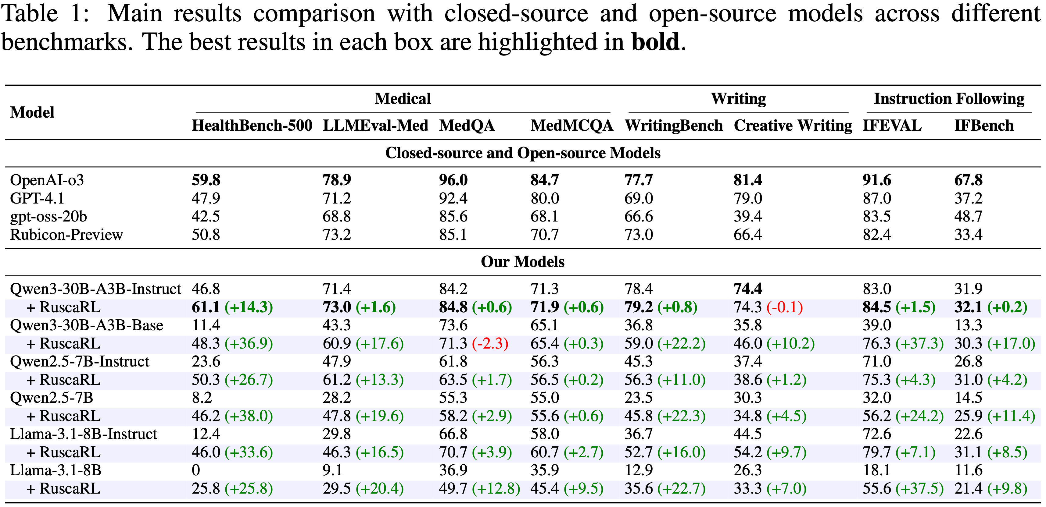 • RuscaRL 始终优于强大的基线方法,并与领先模型相比取得了有竞争力的结果
