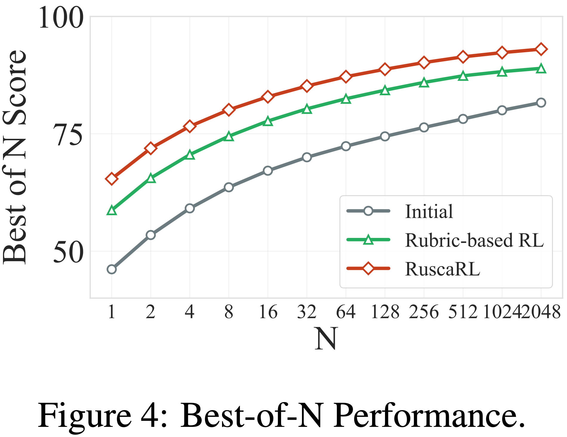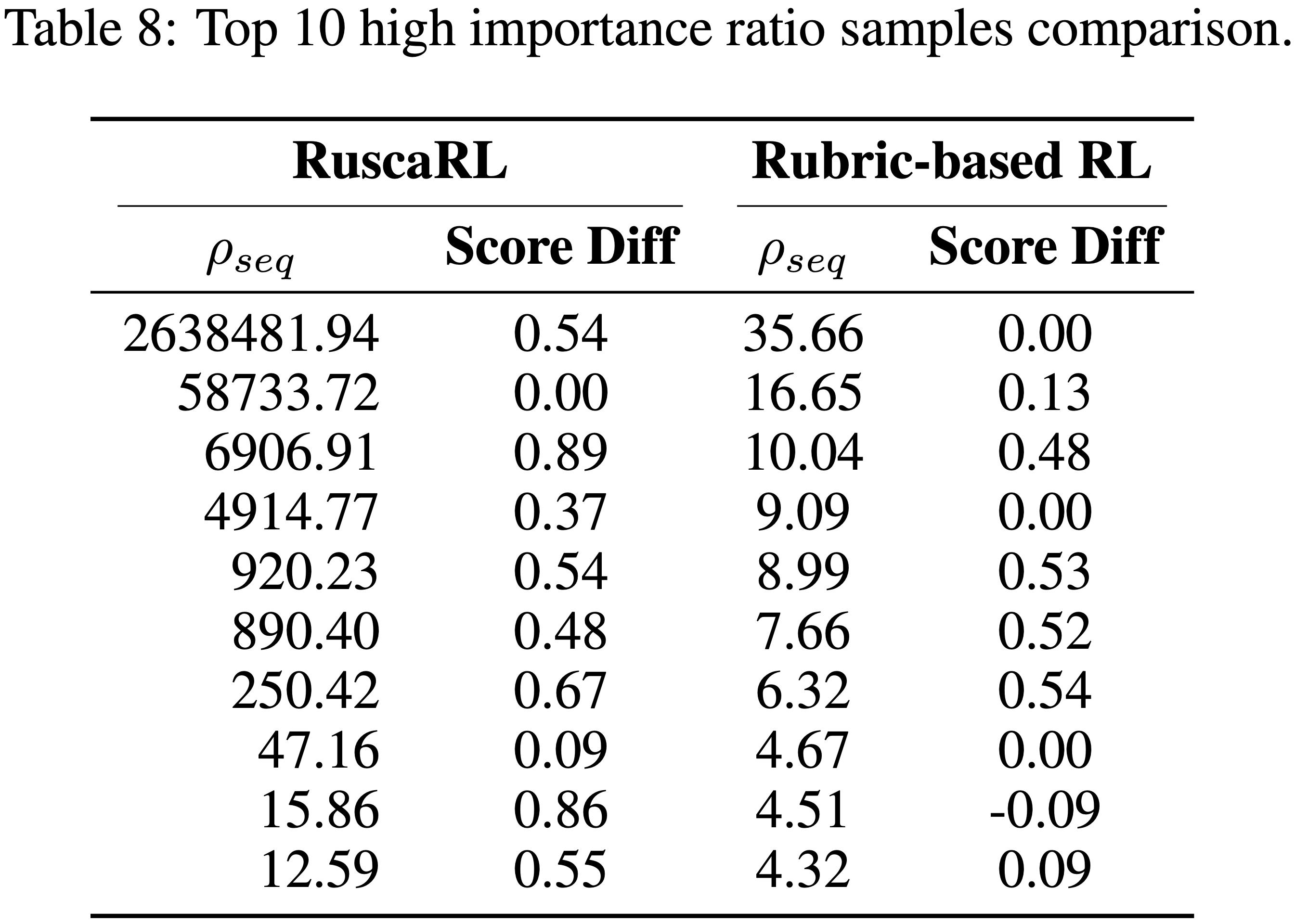 • RuscaRL 的成功突显了社区迫切需要投入更多资源来构建开放、多样且领域丰富的 Rubric 数据集