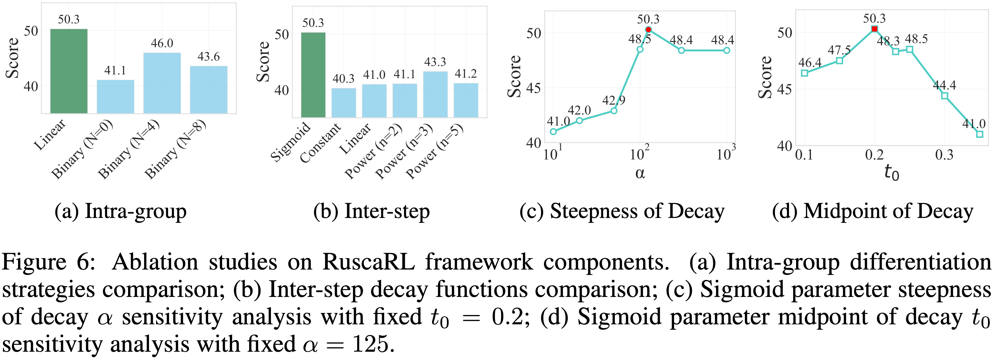 • In Contrast,RuscaRL 通过清单式 Rubric 提供显式脚手架,用可验证的标准引导轨迹,同时通过脚手架衰减实现模式内化