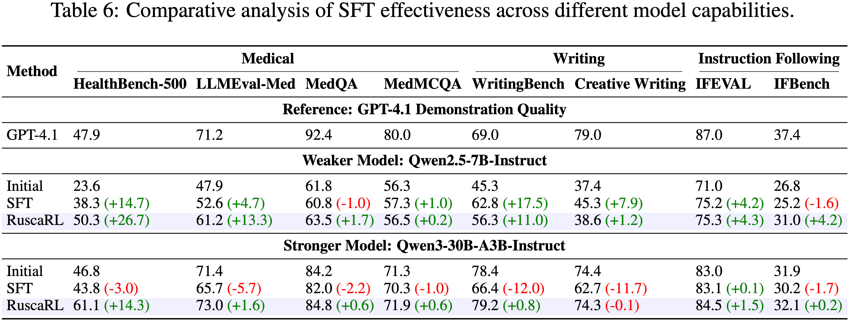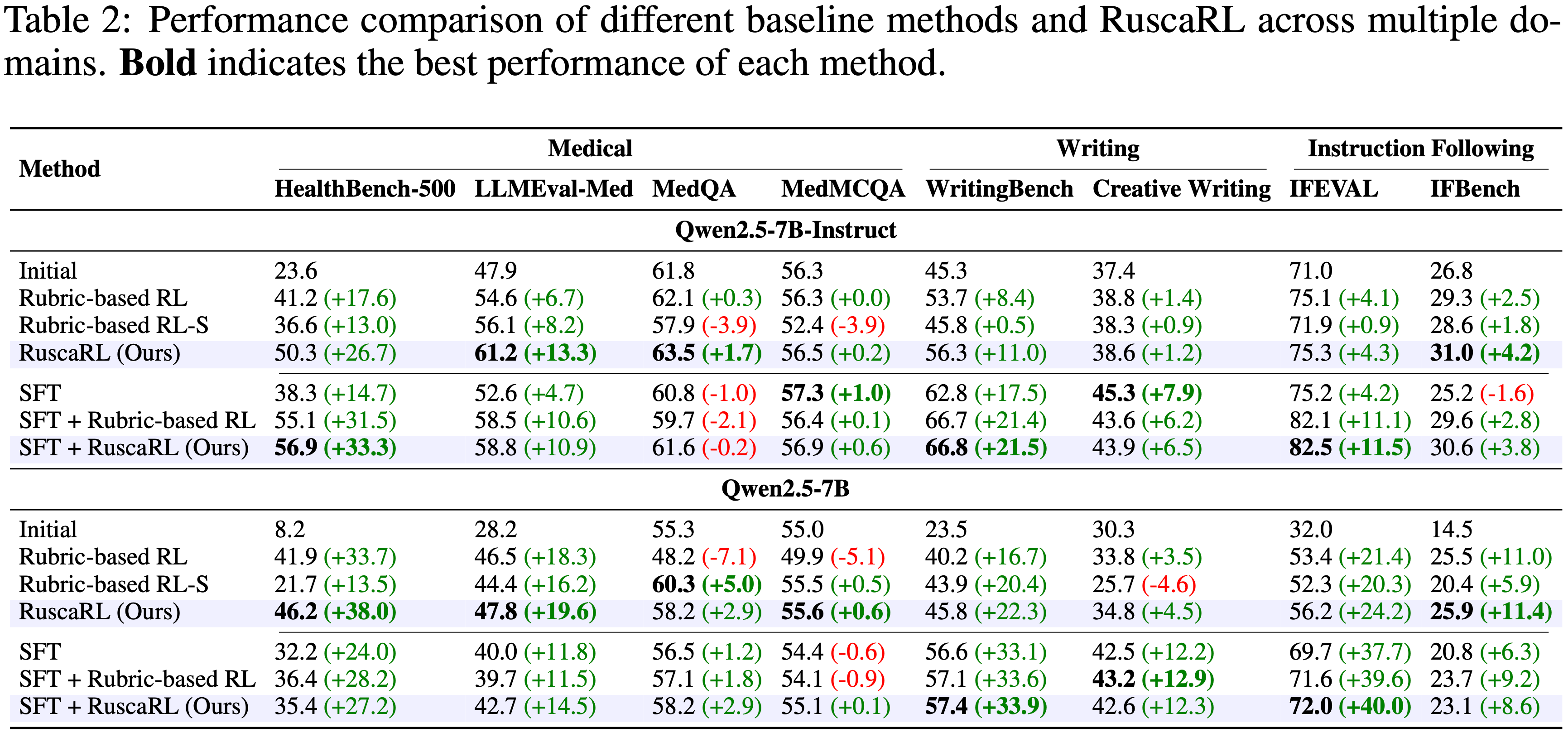 • Notably,RuscaRL 将 Qwen2.5-7B-Instruct 在 HealthBench-500 上的得分从 23.6 显著提升至 50.3,超过了 GPT-4.1