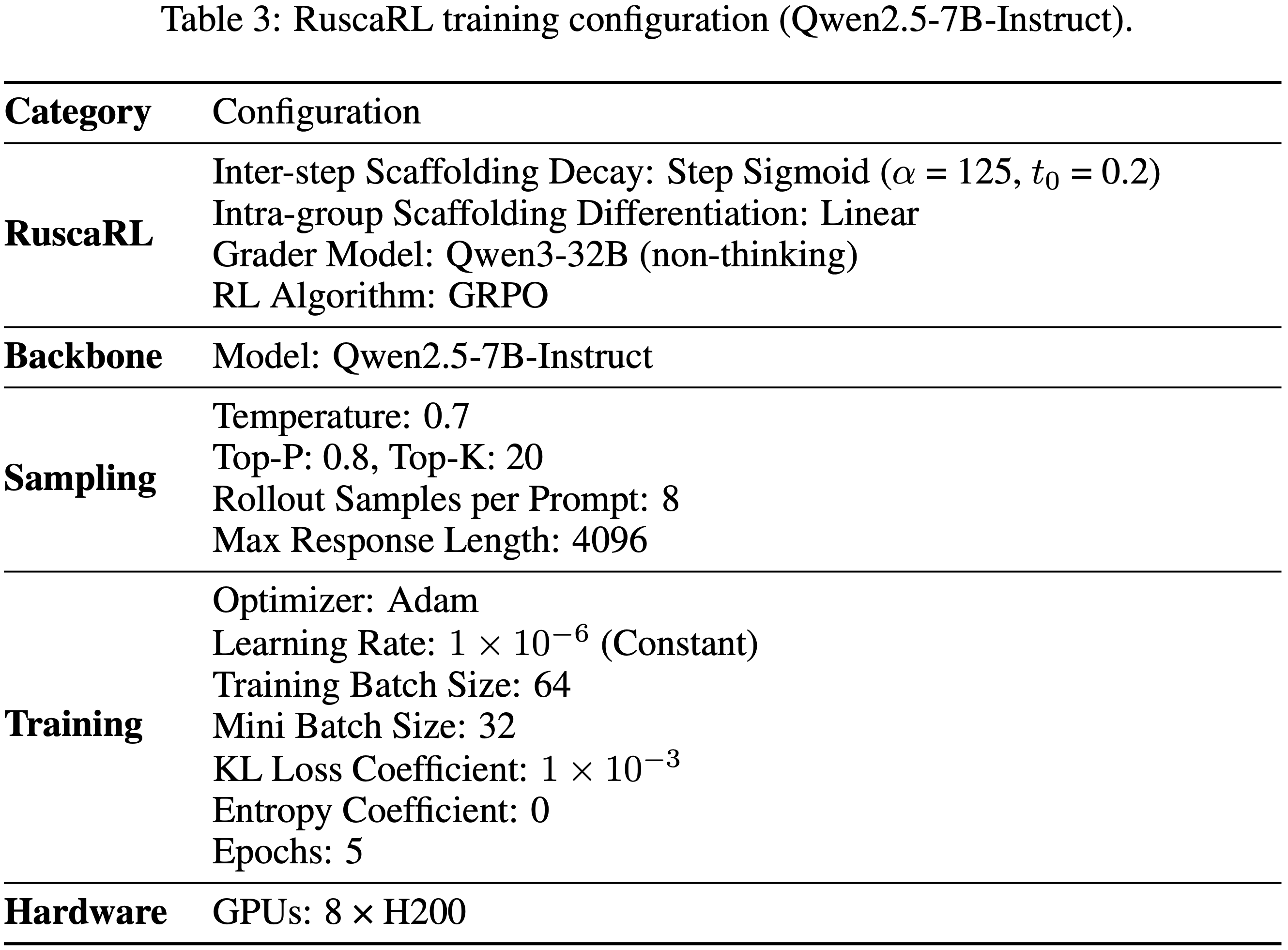 • 论文将教育心理学中的教学 Scaffolding 理论应用于 LLM 的 RL,并提出了 RuscaRL