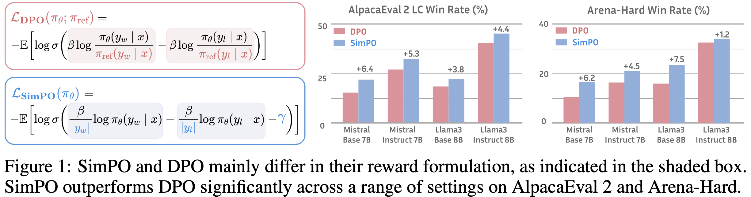 - 与 DPO 相比,SimPO 在 AlpacaEval 2 上提升高达 6.4 分,在 Arena-Hard 上提升高达 7.5 分(如图 1 所示)