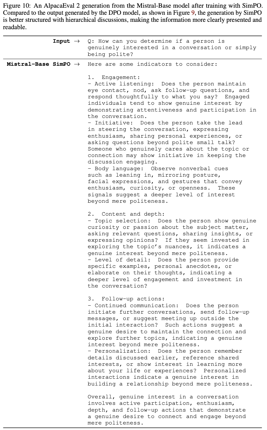 - 在图 9 和图 10 中,论文展示了一个案例,其中 Mistral-Base-SimPO 生成的答案比 Mistral-Base-DPO 结构更好