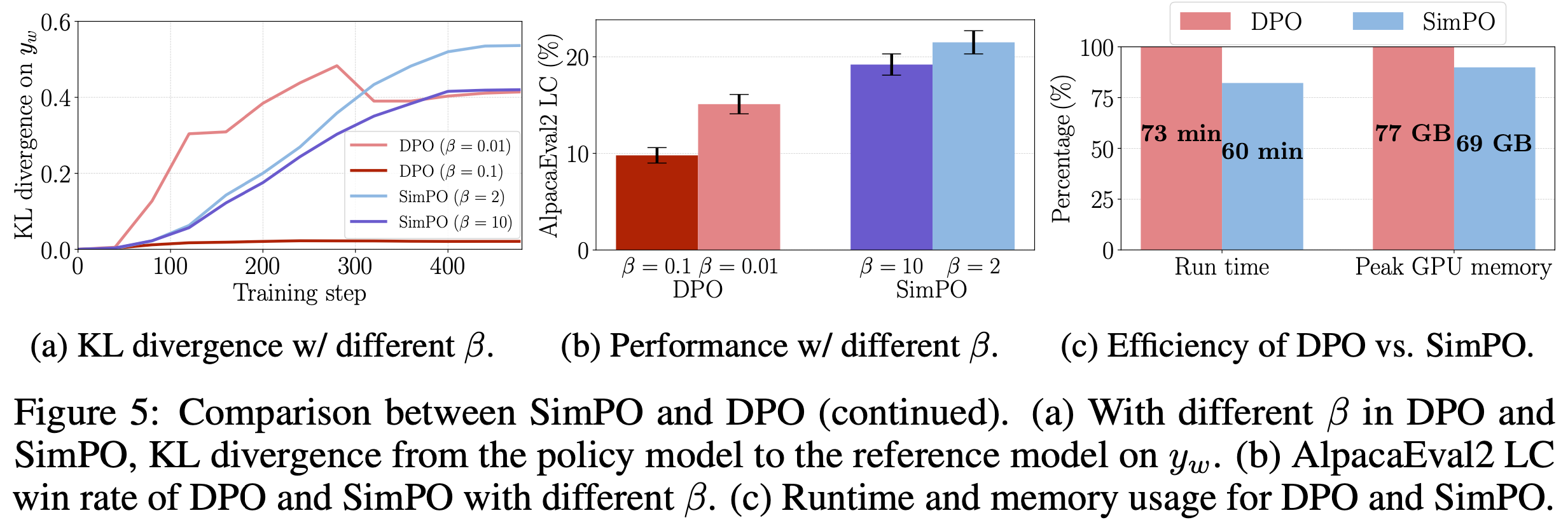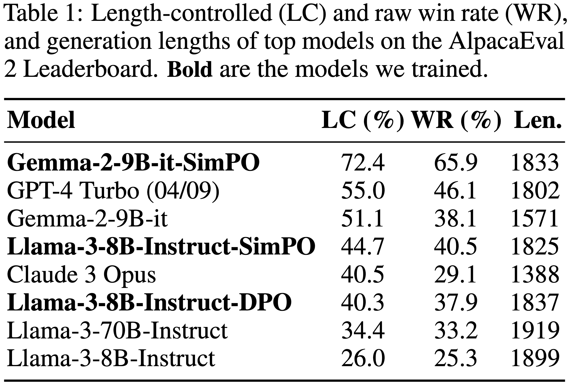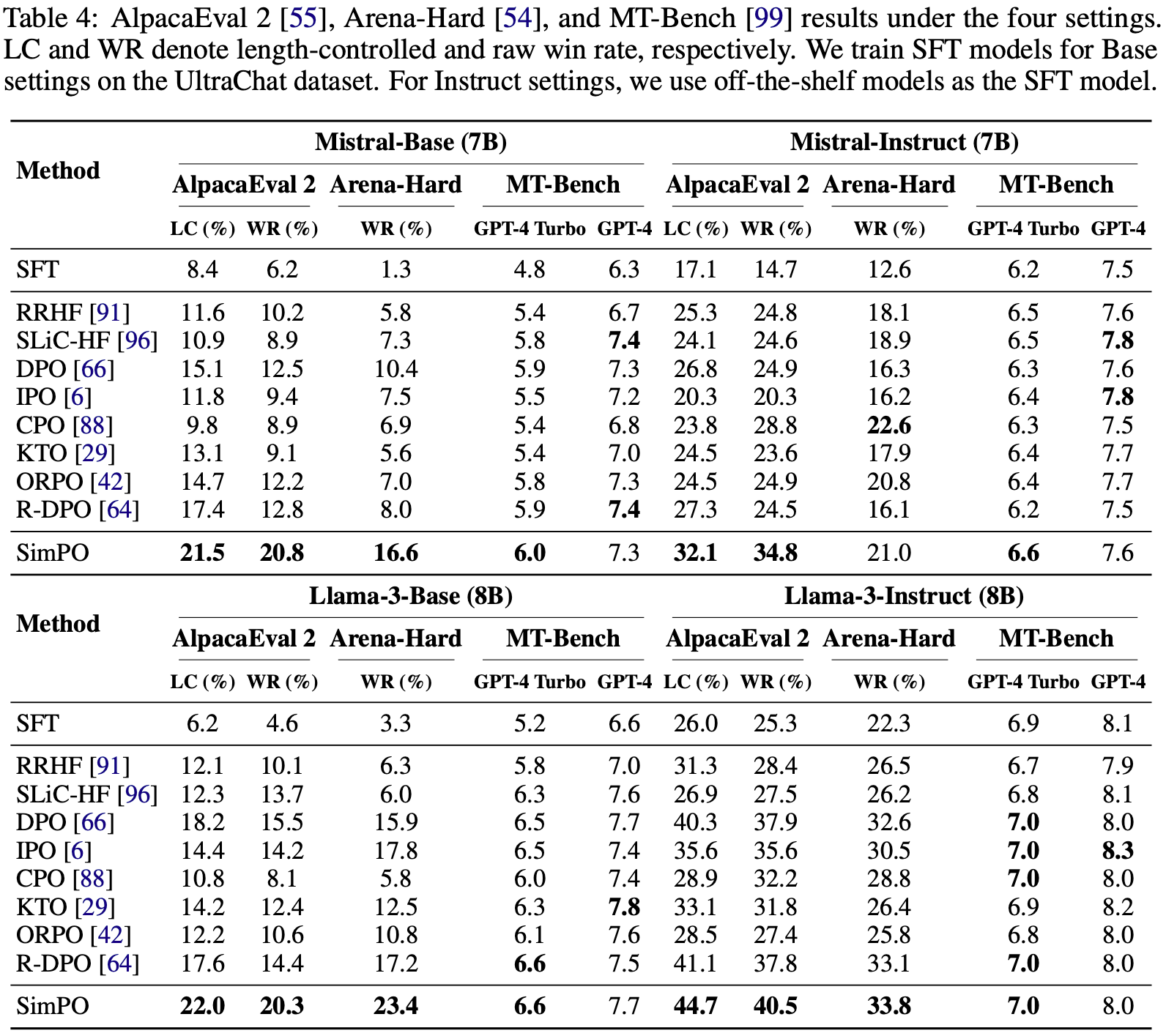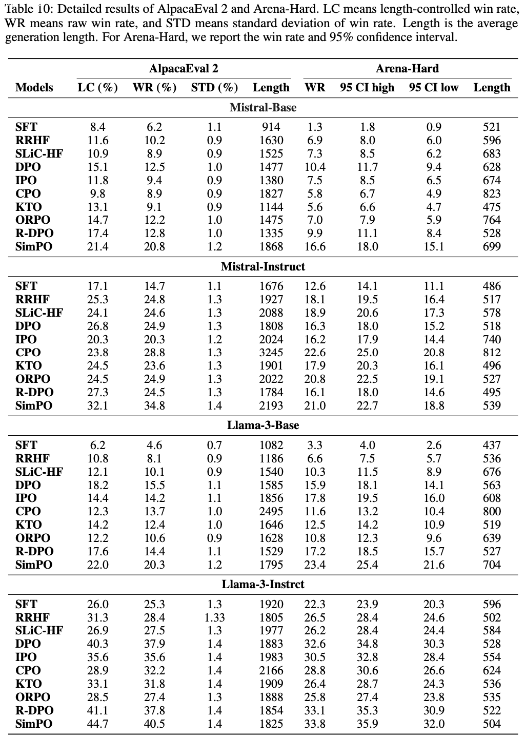 - 然而,SimPO 仍保持优势,生成的序列更短,因此在 AlpacaEval 2 上的长度控制胜率显著更高
