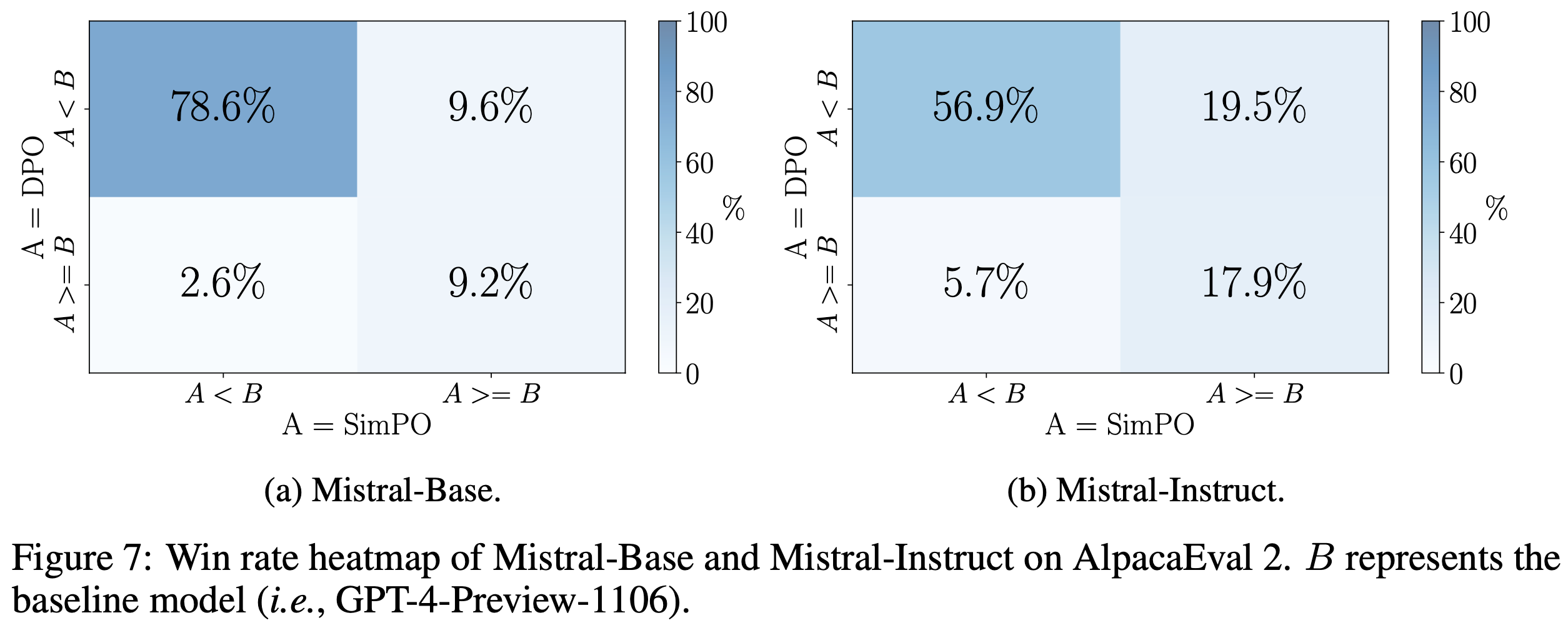- 论文在图 7 和图 8 中分别展示了 Mistral-Base 和 Mistral-Instruct 在 AlpacaEval 2 和 Arena-Hard 上的胜率热图