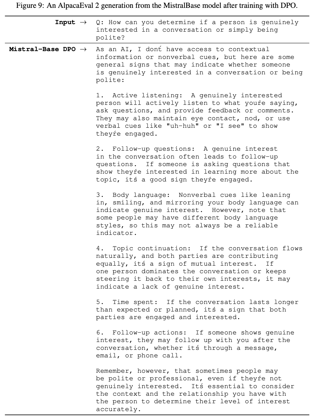 - 给定问题“如何判断一个人对对话是真正感兴趣还是仅仅出于礼貌?”,DPO 模型生成了一长串要点,使得不同点之间的关系难以理解