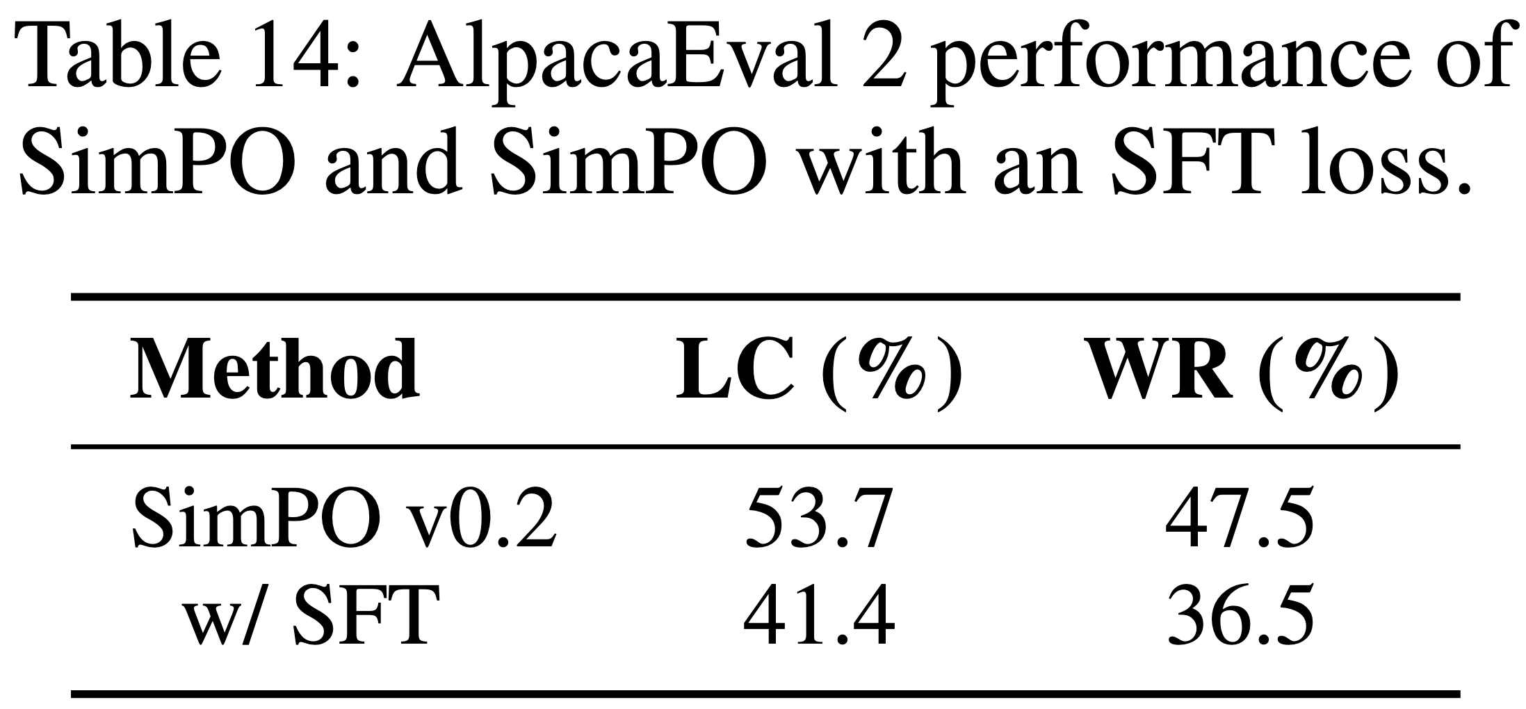 $$ - 如表 14 所示,加入 SFT 正则化后,模型在 AlpacaEval 2 上的性能有所下降