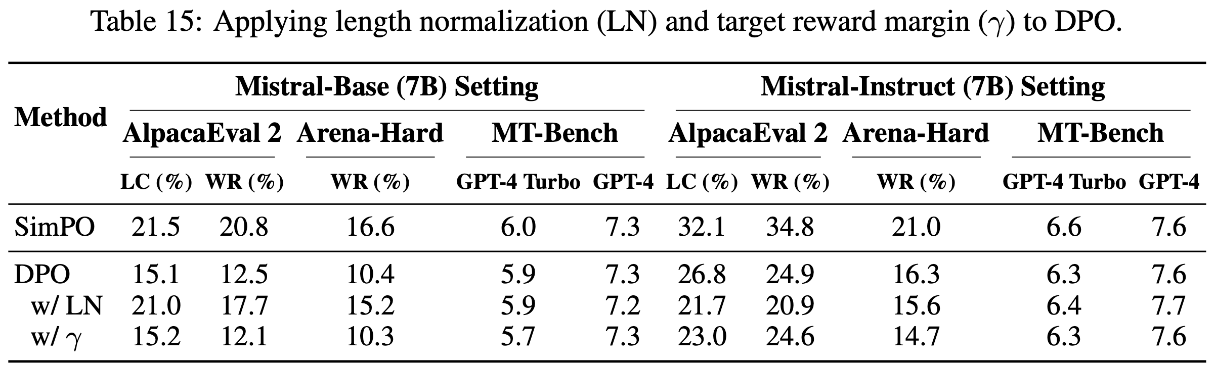 - 结果表明,与 SimPO 不同,长度归一化和目标奖励间隔并不能一致地提升 DPO