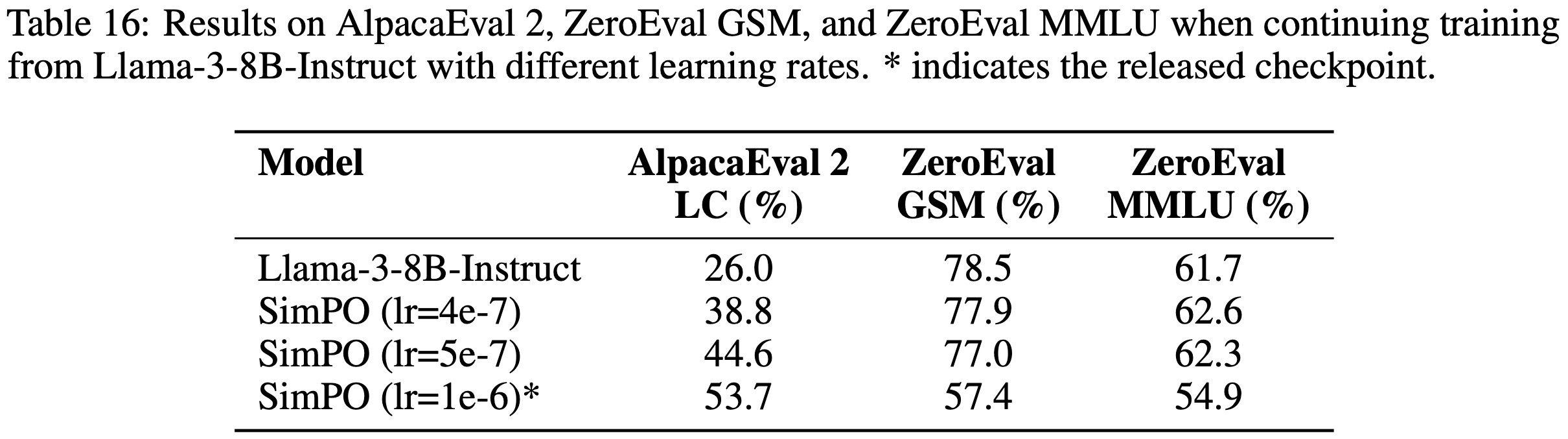 - 为了研究这一问题,论文继续用不同学习率训练 Llama-3-8B-Instruct 模型(见表 16)