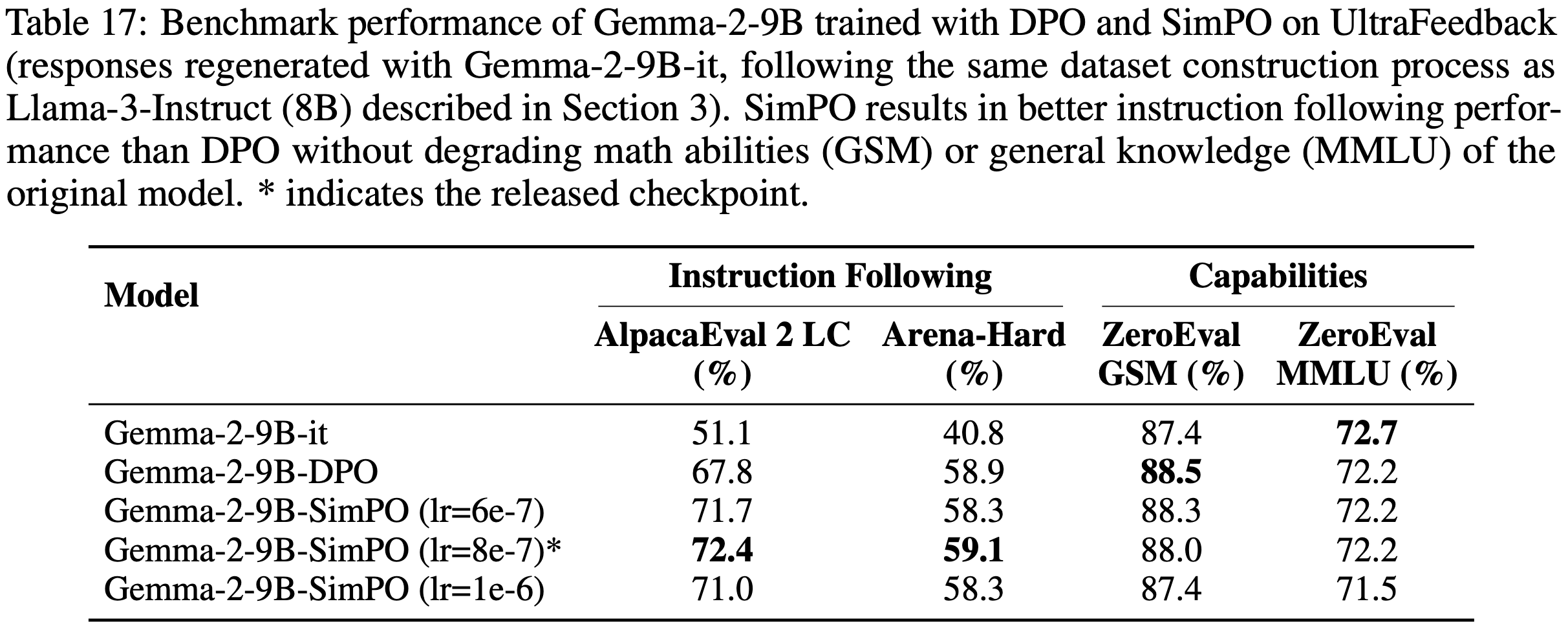 - 论文使用上述目标训练模型,并与 DPO 和 SimPO 的性能进行比较(见表 15)