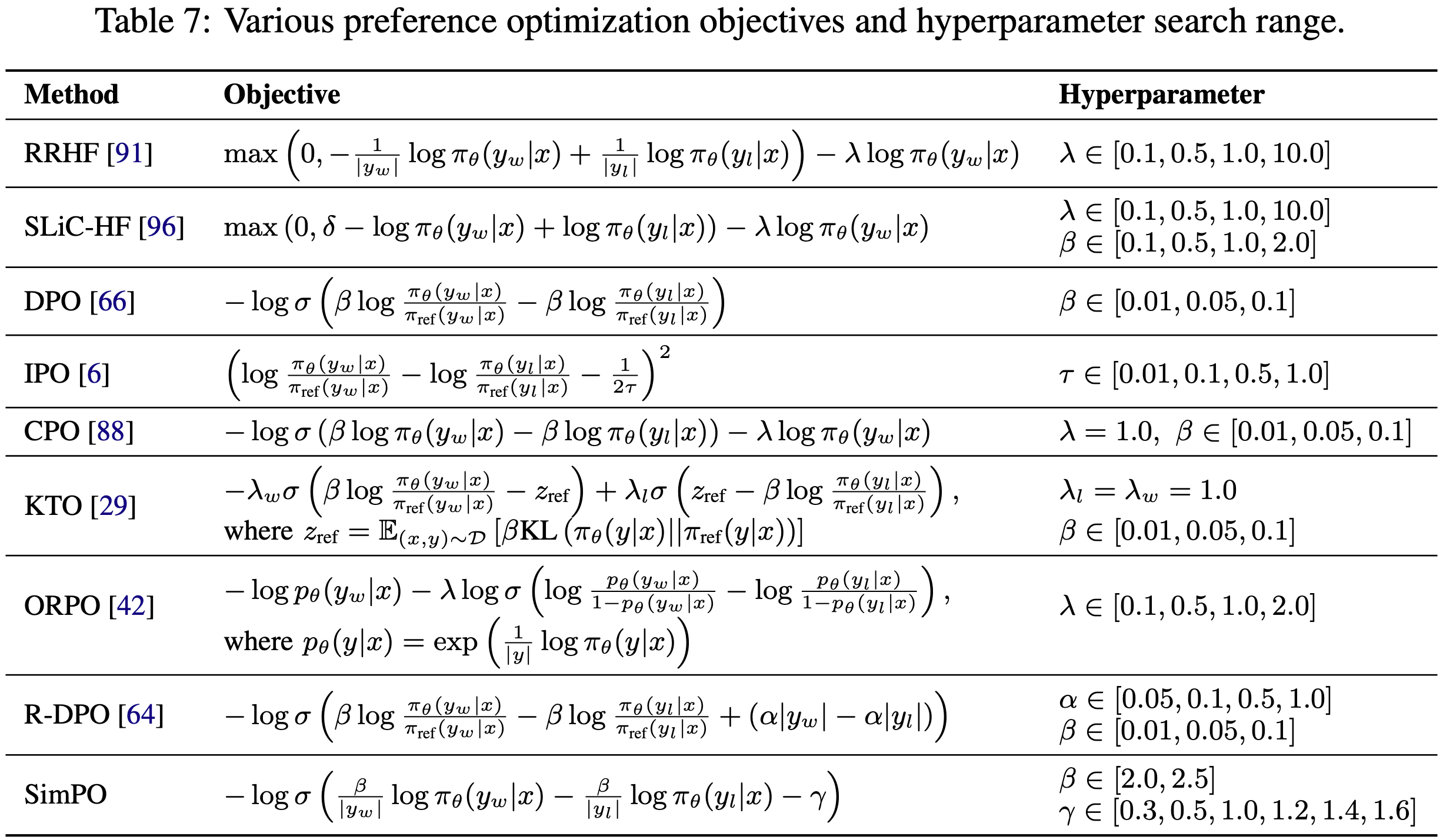 - 一些无需参考模型(reference-free)的算法(如 RRHF(2023)、SLiC-HF(2023)、CPO(2024)和 ORPO(2024))在其目标中使用了 SFT 正则化