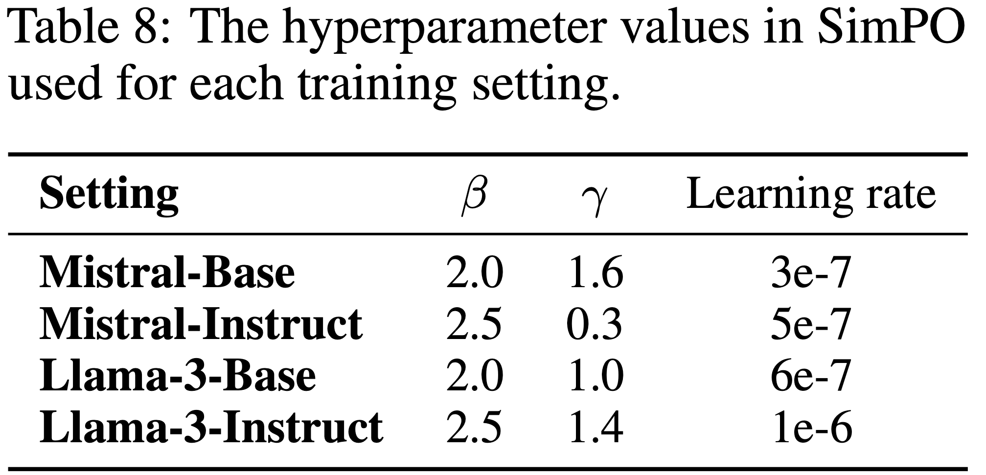 - 论文在 Llama-3-Instruct v0.2 设置下为 SimPO 使用了以下超参数: